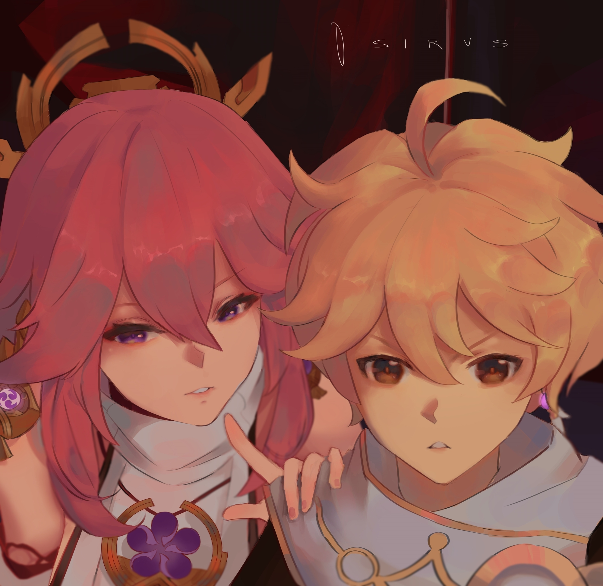 1boy 1girl aether_(genshin_impact) ahoge artist_name blonde_hair commentary d_sirus earrings english_commentary genshin_impact hair_between_eyes highres jewelry long_hair looking_at_viewer necklace parted_lips pink_hair portrait purple_eyes sideways_glance simple_background yae_miko yellow_eyes