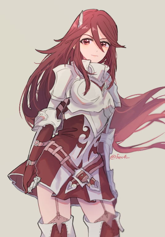 armor artist_name belt belt_buckle breast_armor buckle cordelia_(fire_emblem) fes4 fire_emblem fire_emblem_awakening garter_straps hair_ornament long_hair nintendo red_eyes red_hair simple_background skirt thighhighs