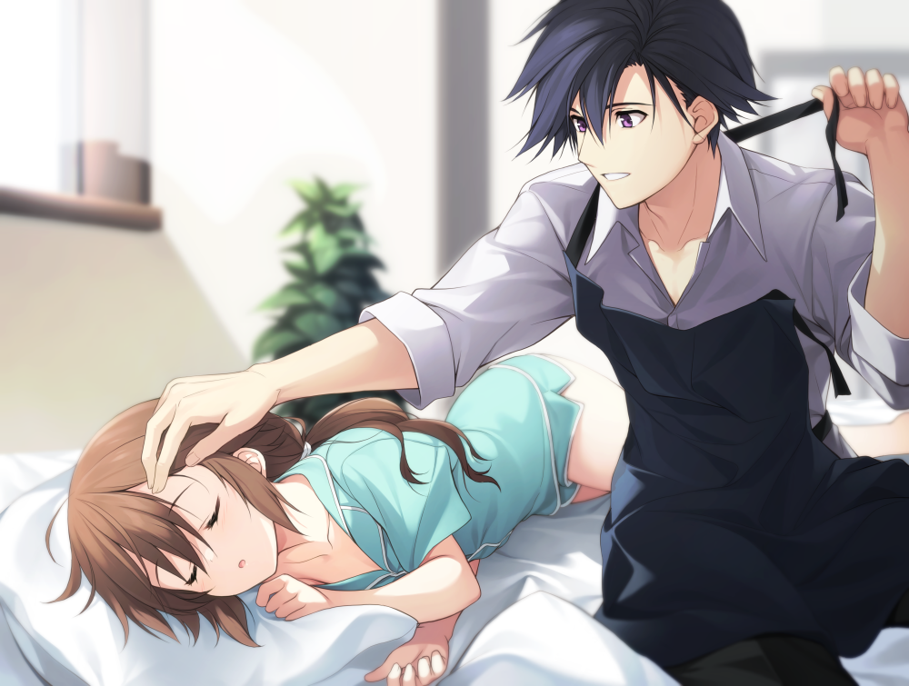 1boy 1girl apron aqua_shirt aqua_shorts black_hair brown_hair closed_eyes collared_shirt dolphin_shorts dress_shirt eiyuu_densetsu falcom hakuleg hand_on_another's_head hetero lying on_side pajamas pillow purple_eyes rean_schwarzer sen_no_kiseki sen_no_kiseki_(series) sen_no_kiseki_i sen_no_kiseki_iii shirt shorts sleeping towa_herschel