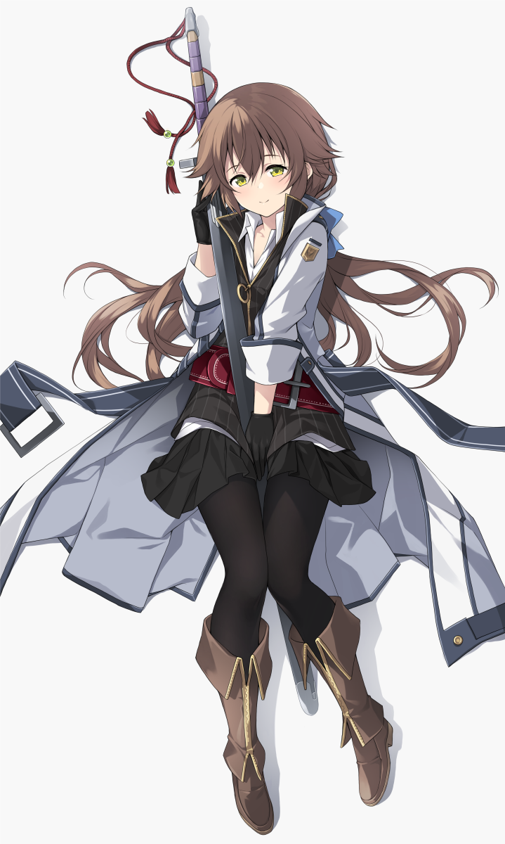 1girl boots bow brown_hair cosplay covering_crotch covering_privates eiyuu_densetsu falcom gloves hair_bow hakuleg highres jacket long_hair pantyhose rean_schwarzer rean_schwarzer_(cosplay) sen_no_kiseki sen_no_kiseki_(series) sen_no_kiseki_i sen_no_kiseki_iii simple_background skirt smile solo sword towa_herschel very_long_hair weapon white_background yellow_eyes