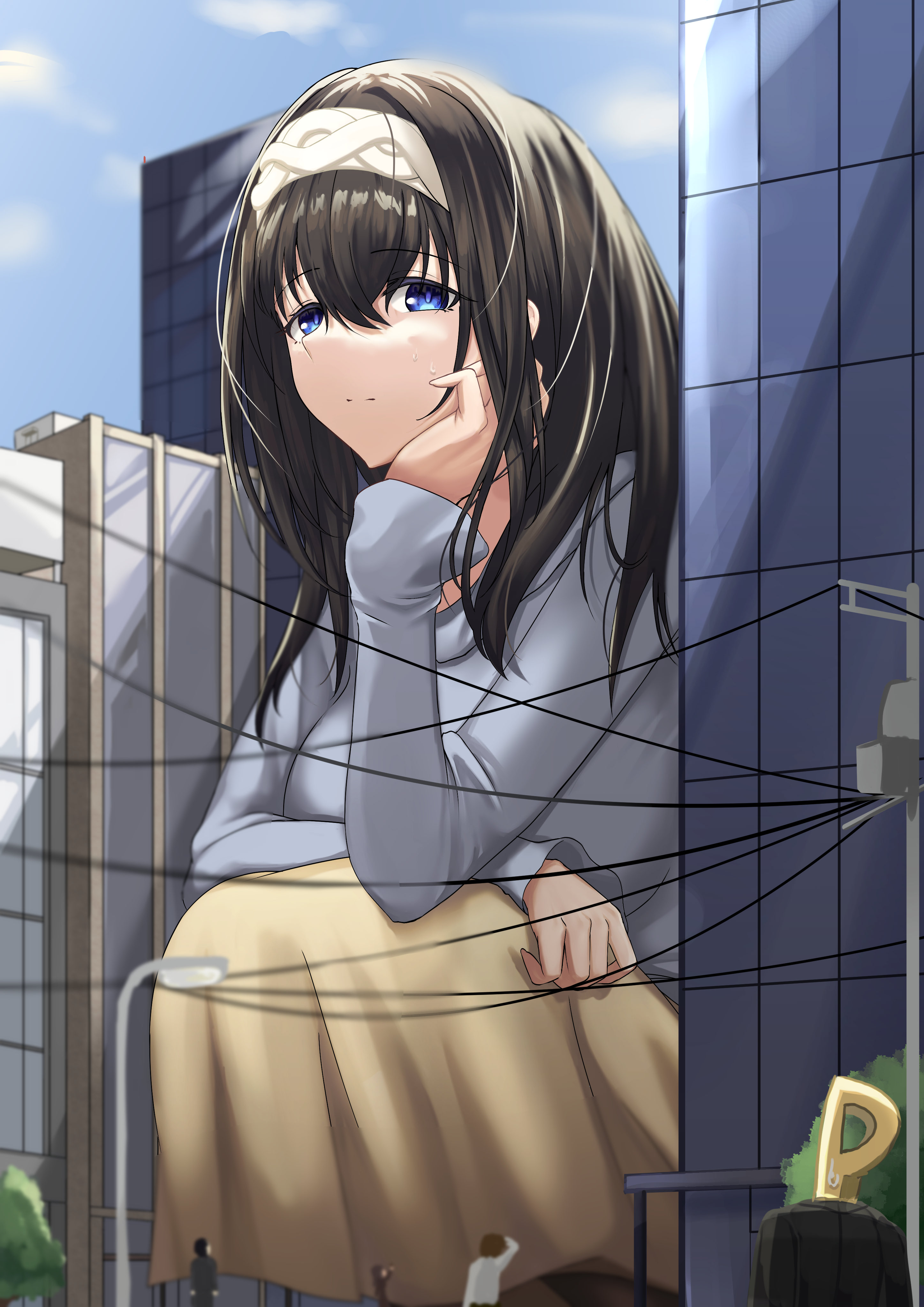 1girl absurdres arisugawa_ya black_hair blue_eyes building city commission giant giantess grey_sweater hairband highres idolmaster idolmaster_cinderella_girls long_hair long_skirt long_sleeves p-head_producer power_lines producer_(idolmaster) sagisawa_fumika skeb_commission skirt squatting sweater utility_pole white_hairband