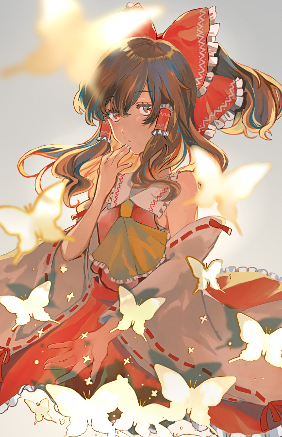 1girl ascot blush bow brown_hair bug butterfly closed_mouth commentary cowboy_shot detached_sleeves frilled_bow frilled_hair_tubes frills hair_between_eyes hair_bow hair_tubes hakurei_reimu hand_up insect long_hair looking_at_viewer ponytail red_bow red_eyes red_skirt red_vest rekoku ribbon-trimmed_sleeves ribbon_trim sidelocks skirt skirt_set solo touhou vest white_sleeves wide_sleeves yellow_ascot