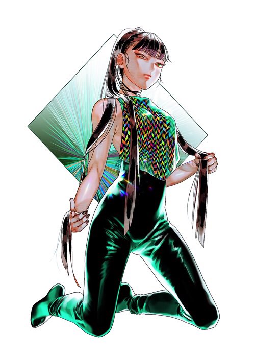 1girl backlighting black_hair black_nails blunt_bangs blunt_ends expressionless halterneck high-waist_pants high_ponytail holding holding_own_hair kneeling leather leather_pants long_hair looking_down multicolored_shirt nail_polish no_shoes original pants ponytail print_shirt qt1_jo shirt sleeveless socks solo very_long_hair white_background