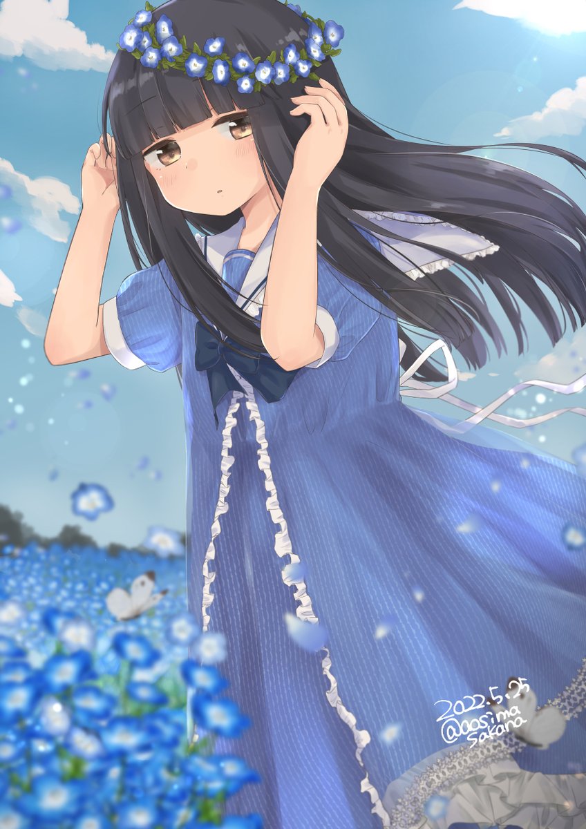 1girl alternate_costume aoshima_sakana black_hair blue_dress blunt_bangs brown_eyes bug butterfly commentary_request commission dated dress flower hatsuyuki_(kancolle) highres hime_cut insect kantai_collection long_hair looking_at_viewer puffy_short_sleeves puffy_sleeves sailor_collar short_sleeves skeb_commission solo twitter_username wreath