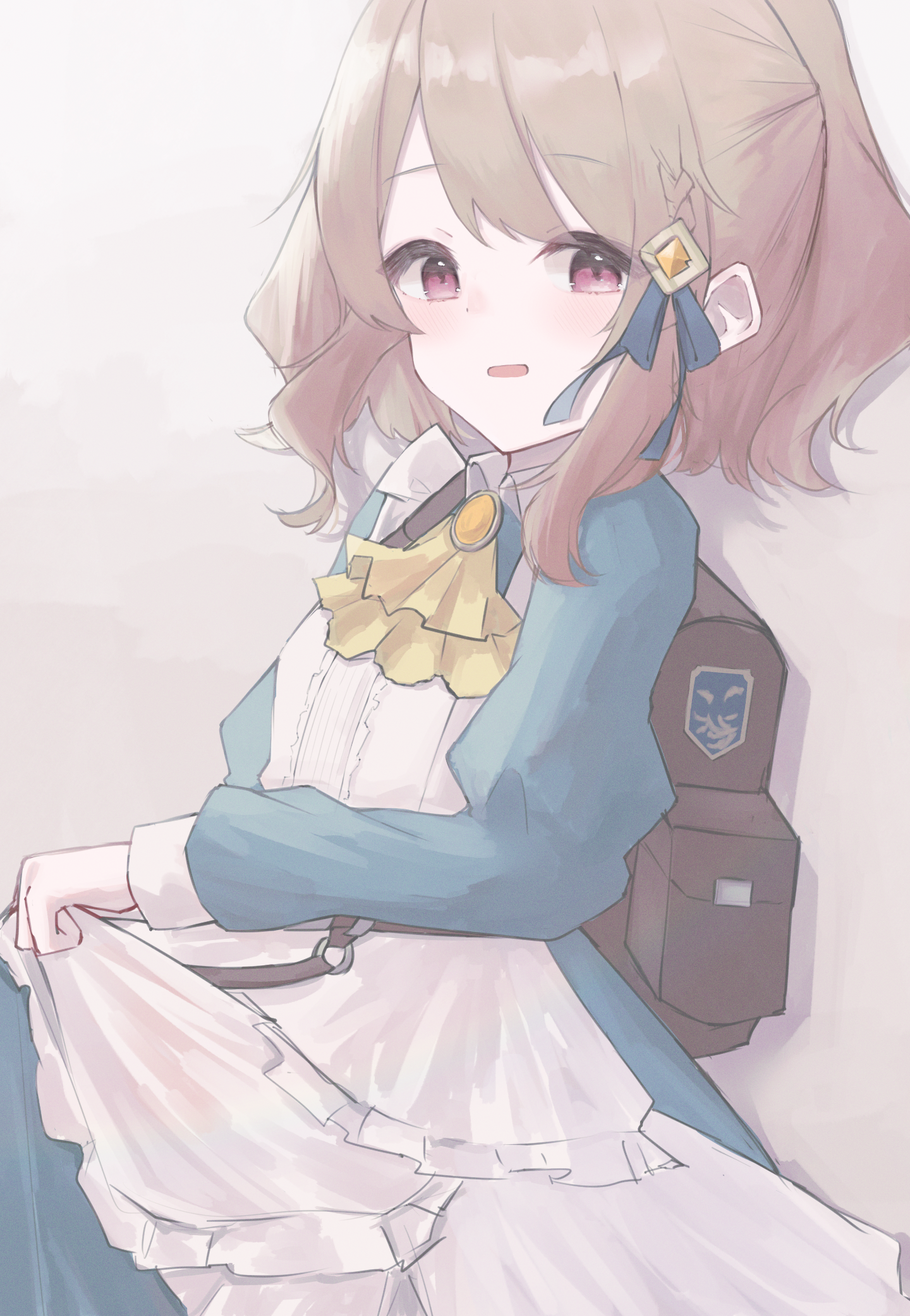 1girl :o apron bag bow bowtie brown_background brown_bag brown_hair fujina_(fujina31q) highres holding_own_dress red_eyes solo tagme tino_(ikeuchi_tanuma) yellow_bow yellow_bowtie