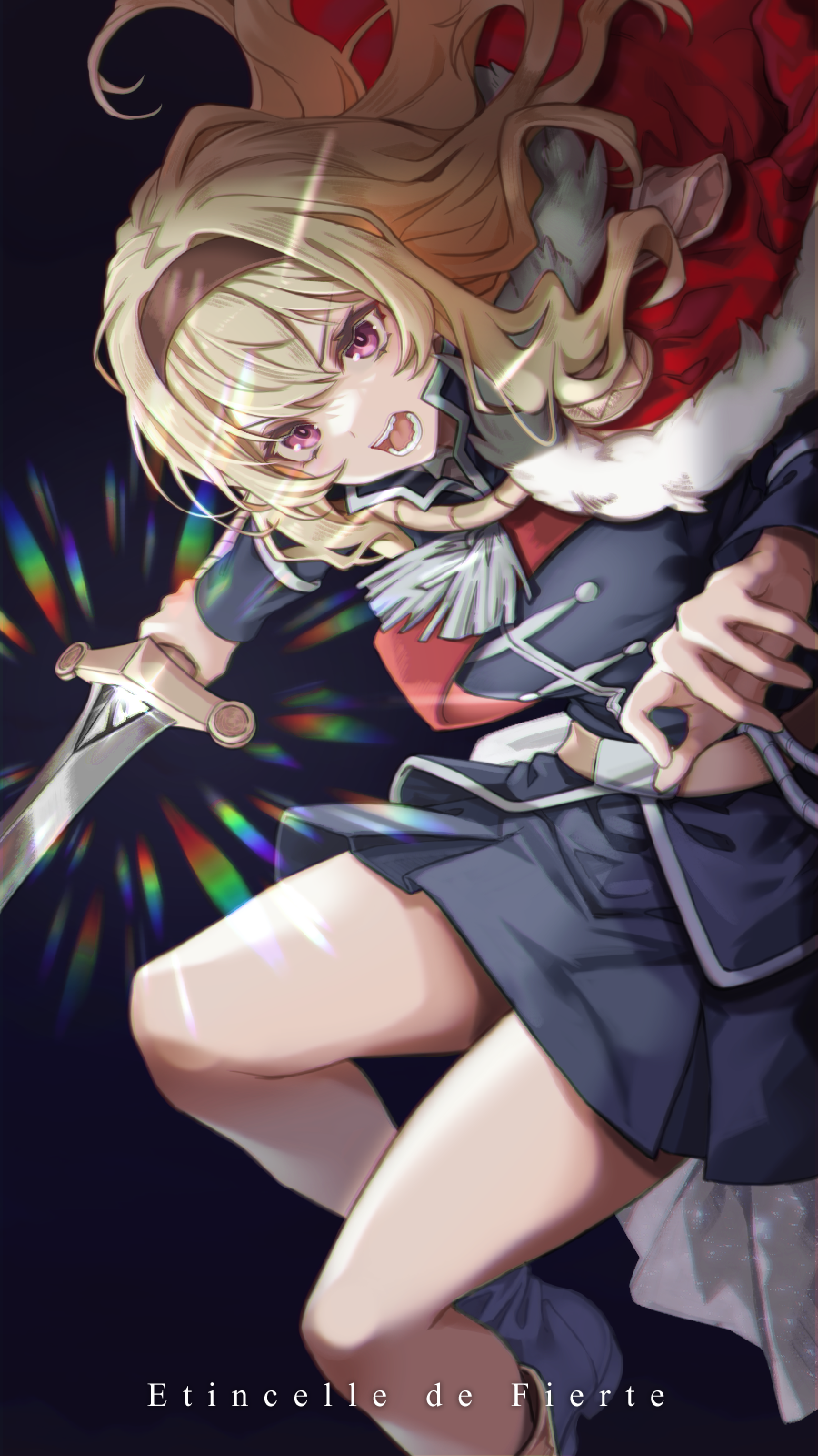 1girl angry belt belt_buckle black_background black_boots black_jacket black_skirt blonde_hair boots brown_belt brown_hairband buckle commentary feet_out_of_frame floating_hair fur-trimmed_jacket fur_trim glint hair_between_eyes hairband hands_up hatori_you high_collar highres holding holding_sword holding_weapon jacket jacket_on_shoulders long_hair long_sleeves looking_at_viewer miniskirt open_mouth outstretched_arm pink_eyes pleated_skirt red_jacket red_sash saijo_claudine sash shoujo_kageki_revue_starlight shoulder_sash sidelocks simple_background skirt solo sword tassel teeth v-shaped_eyebrows waist_cape wavy_hair weapon