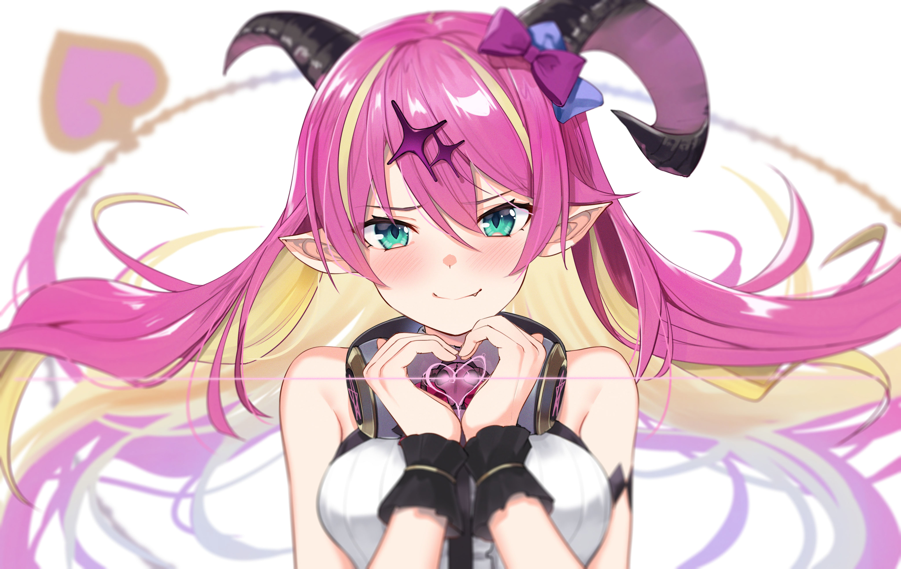 1girl asymmetrical_horns blonde_hair blue_bow blush bow breasts closed_mouth colored_inner_hair curled_horns demon_horns fang fang_out floating_hair green_eyes hair_between_eyes hair_bow heart heart_hands highres hololive horns long_hair mano_aloe medium_breasts multicolored_hair pink_hair pointy_ears purple_bow shirt simple_background sleeveless sleeveless_shirt smile solo uneven_horns upper_body virtual_youtuber white_background white_shirt yuuzuki_(re'ef)