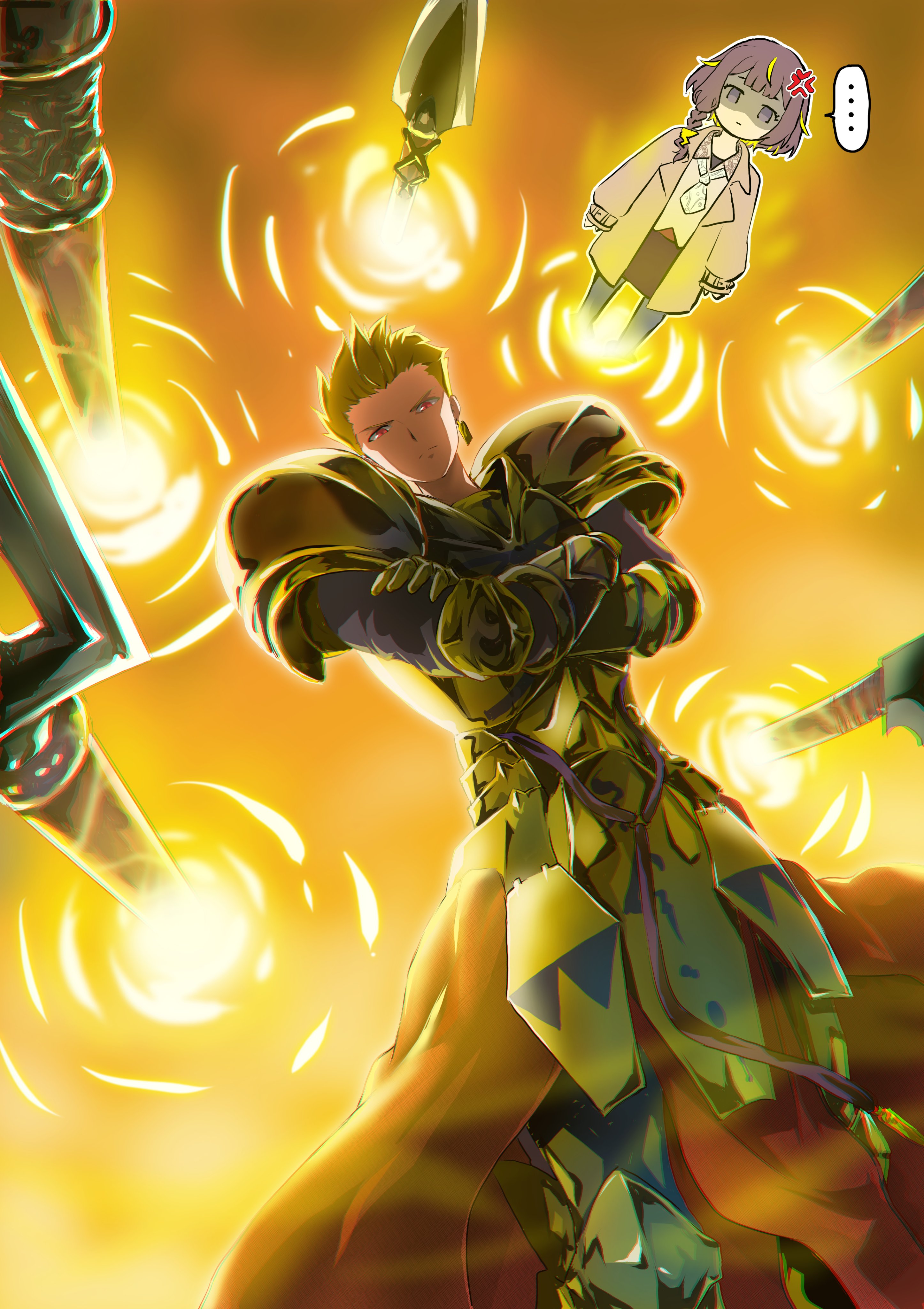 1boy 1girl absurdres anya_melfissa armor blonde_hair brown_hair comically_serious commentary crossover fate/grand_order fate/zero fate_(series) gate_of_babylon_(fate) gilgamesh_(fate) gold_armor highres hololive hololive_indonesia multiple_weapons purple_eyes red_eyes shaded_face sorayomi_daichi sword toned too_many_weapons virtual_youtuber wavy_hair weapon