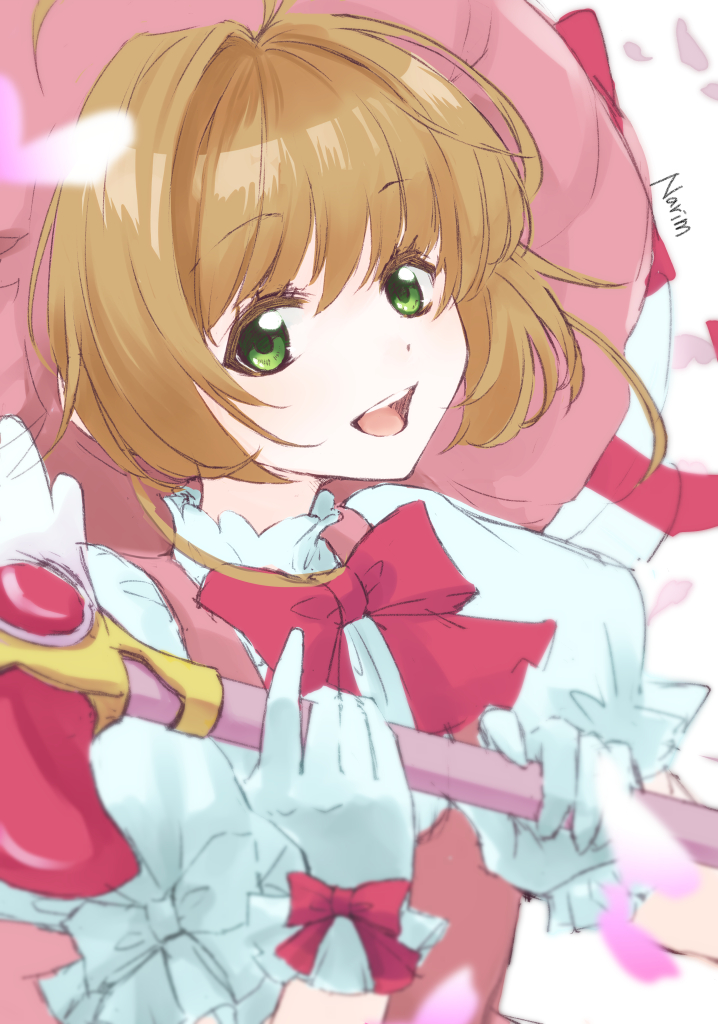 1girl bow brown_hair cardcaptor_sakura gloves green_eyes kinomoto_sakura kinomoto_sakura_(magician) magical_girl narim open_mouth pink_footwear red_bow solo teeth white_bow white_gloves
