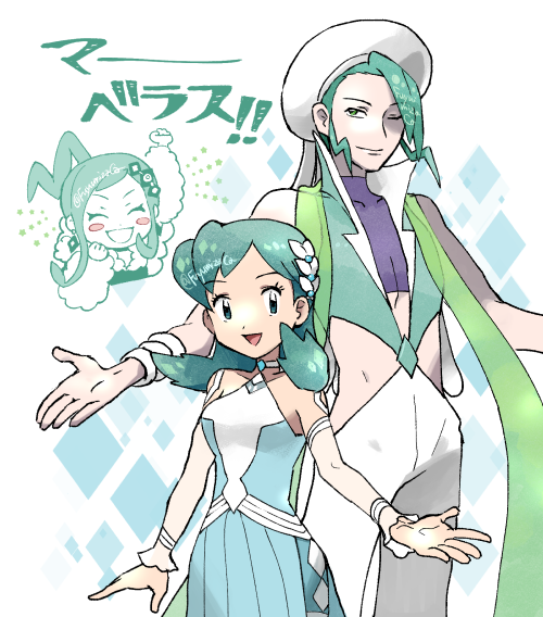 1boy 2girls :d aqua_dress aqua_eyes aqua_hair bare_shoulders breasts cheering chibi chibi_inset choker closed_eyes collarbone commentary_request dress fuyumizaka gym_leader hair_ornament halter_dress halterneck happy jewelry kris_(pokemon) kris_(sygna_suit)_(pokemon) lisia_(pokemon) medium_hair multiple_girls nintendo official_alternate_costume one_eye_closed open_mouth pendant pokemon pokemon_masters_ex pokemon_omega_ruby_and_alpha_sapphire purple_shirt scarf shirt shorts shorts_under_dress side_slit small_breasts smile wallace_(pokemon) white_headwear wrist_cuffs