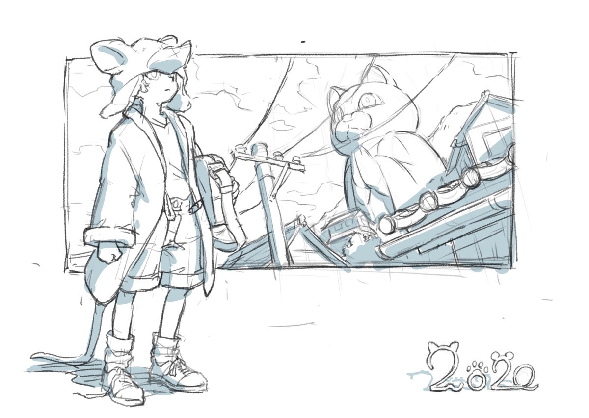 1boy 2020 animal_ears bag bolero_(bo_le_ro66) chinese_zodiac closed_mouth cloud coat fake_animal_ears greyscale hat holding holding_bag male_focus monochrome mountain open_clothes open_coat original shoes shorts sketch sneakers solo standing tail utility_pole year_of_the_rat