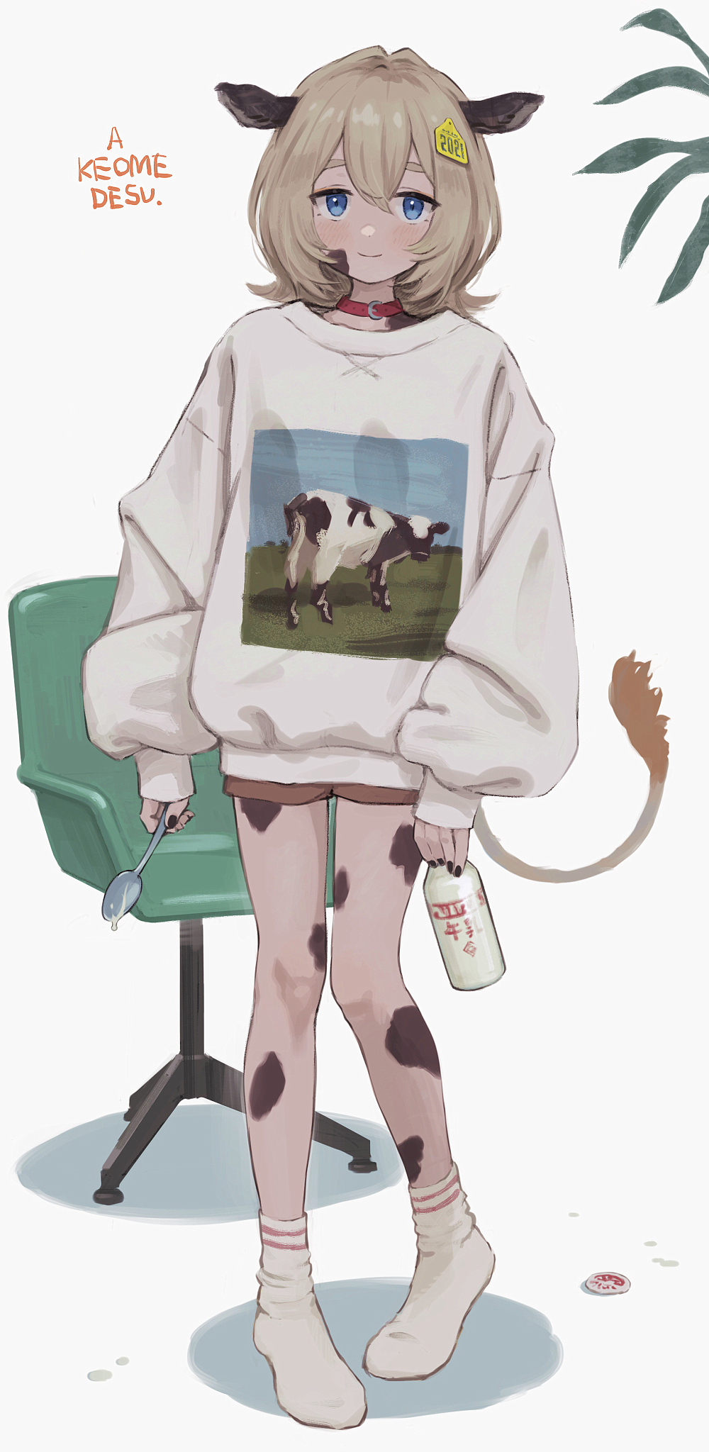 1girl 2021 animal_ears atom_heart_mother black_nails blonde_hair blue_eyes blush bolero_(bo_le_ro66) bottle chair chinese_zodiac choker closed_mouth cow_ears cow_girl cow_tail dripping ear_tag fingernails grey_background highres holding holding_bottle holding_spoon long_sleeves looking_at_viewer medium_hair milk milk_bottle nail_polish no_shoes original pink_floyd plant red_choker sleeves_past_wrists smile socks solo spoon standing tail year_of_the_ox