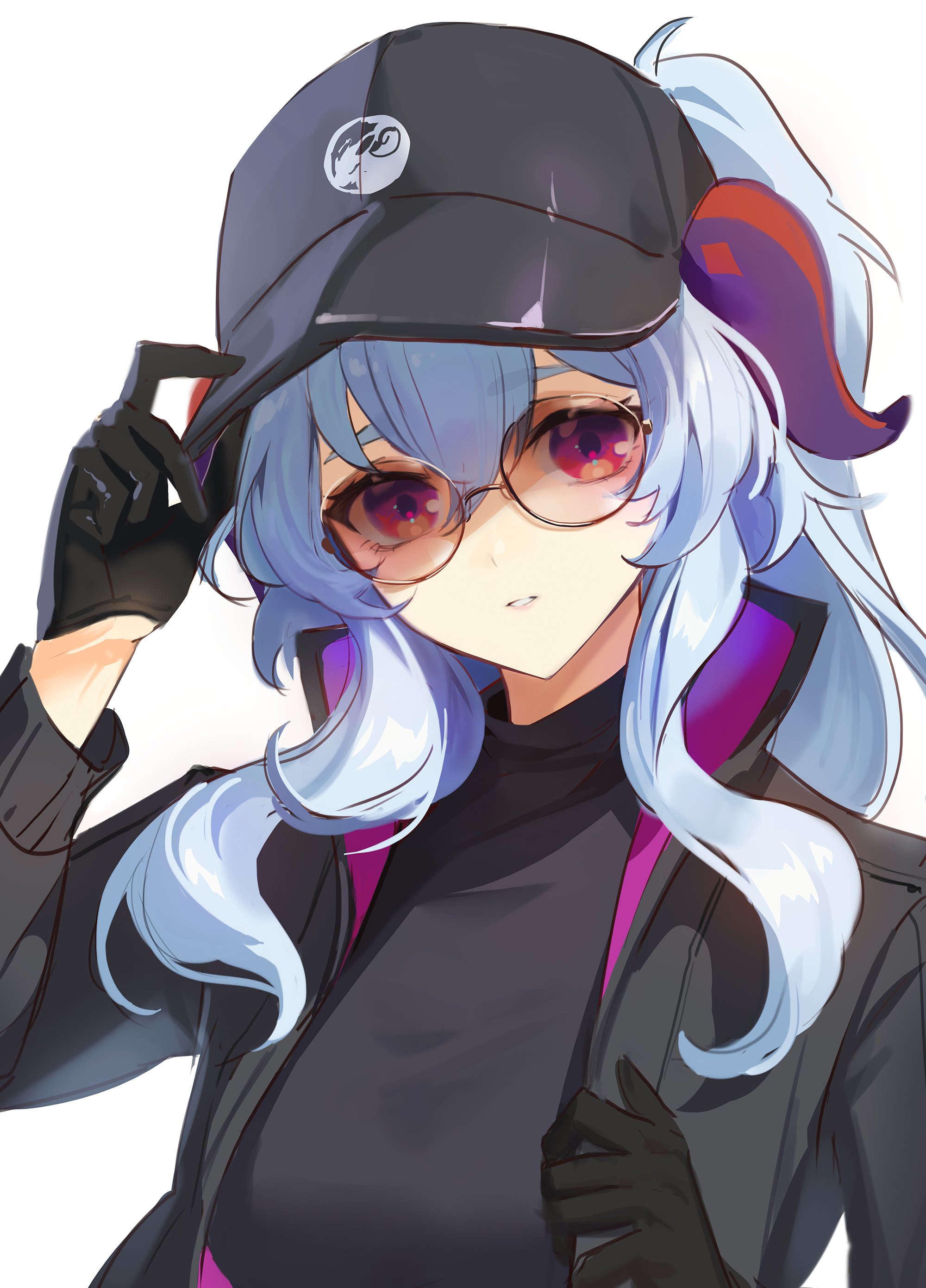 0jae 1girl absurdres alternate_costume alternate_hairstyle baseball_cap black_gloves black_hat black_jacket black_sweater blue_hair breasts ganyu_(genshin_impact) genshin_impact gloves hair_between_eyes hand_on_headwear hat highres horns jacket long_hair long_sleeves looking_at_viewer medium_breasts parted_lips ponytail purple_eyes simple_background solo sunglasses sweater tinted_eyewear upper_body white_background