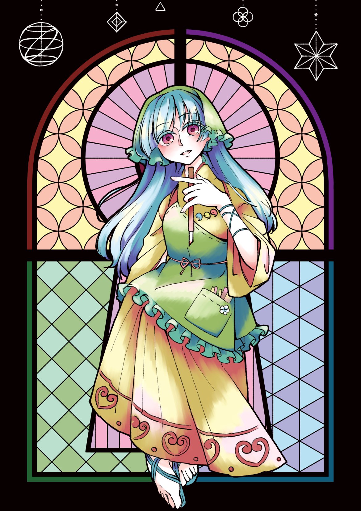 1girl apron aquanzu blue_hair dress green_apron green_headscarf green_headwear haniyasushin_keiki headscarf highres jewelry knife long_hair looking_at_viewer magatama magatama_necklace necklace object_in_pocket open_mouth paintbrush pink_eyes pliers pocket ribbon sandals tools touhou vitreous wily_beast_and_weakest_creature yellow_dress