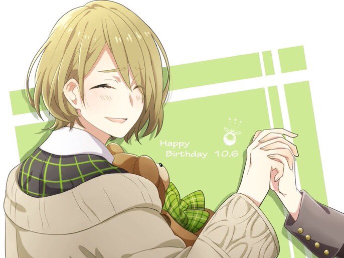 1boy blonde_hair bow brown_jacket charade_maniacs chigasaki_mamoru dated green_bow hair_over_one_eye happy_birthday holding_hands jacket long_sleeves mikesabi0303 plaid_bow short_hair simple_background smile stuffed_animal stuffed_toy teddy_bear