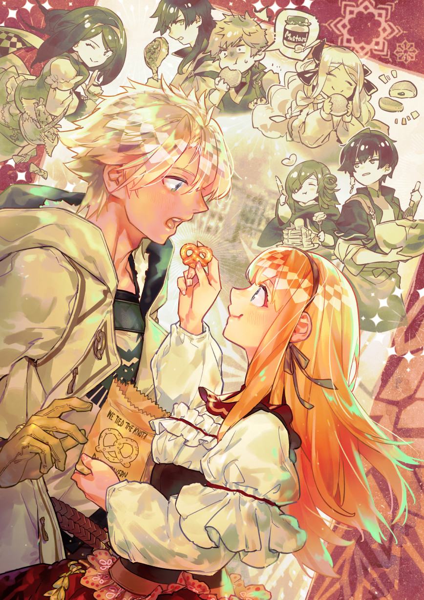3girls 4boys black_hair blue_eyes brown_hair character_request dress eating eye_contact feeding food fork gloves haitaka_no_psychedelica hexagonics highres jed_(haiaka_no_psychedelica) lavan_(haitaka_no_psychedelica) levi_(haitaka_no_psychedelica) long_hair looking_at_another lugus_(haitaka_no_psychedelica) meat mixing_bowl multiple_boys multiple_girls open_mouth pancake pretzel spoken_food tee_(haitaka_no_psychedelica) tou_no_nushi white_hair