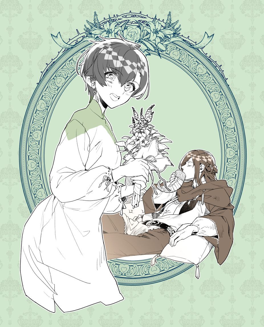 1boy 1girl :d belt black_hair braid brown_hair brown_pants couch dress earrings closed_eyes flower green_background haitaka_no_psychedelica hexagonics holding holding_flower jed_(haiaka_no_psychedelica) jewelry long_sleeves looking_at_viewer on_couch open_mouth pants pillow short_hair smile tou_no_nushi white_dress
