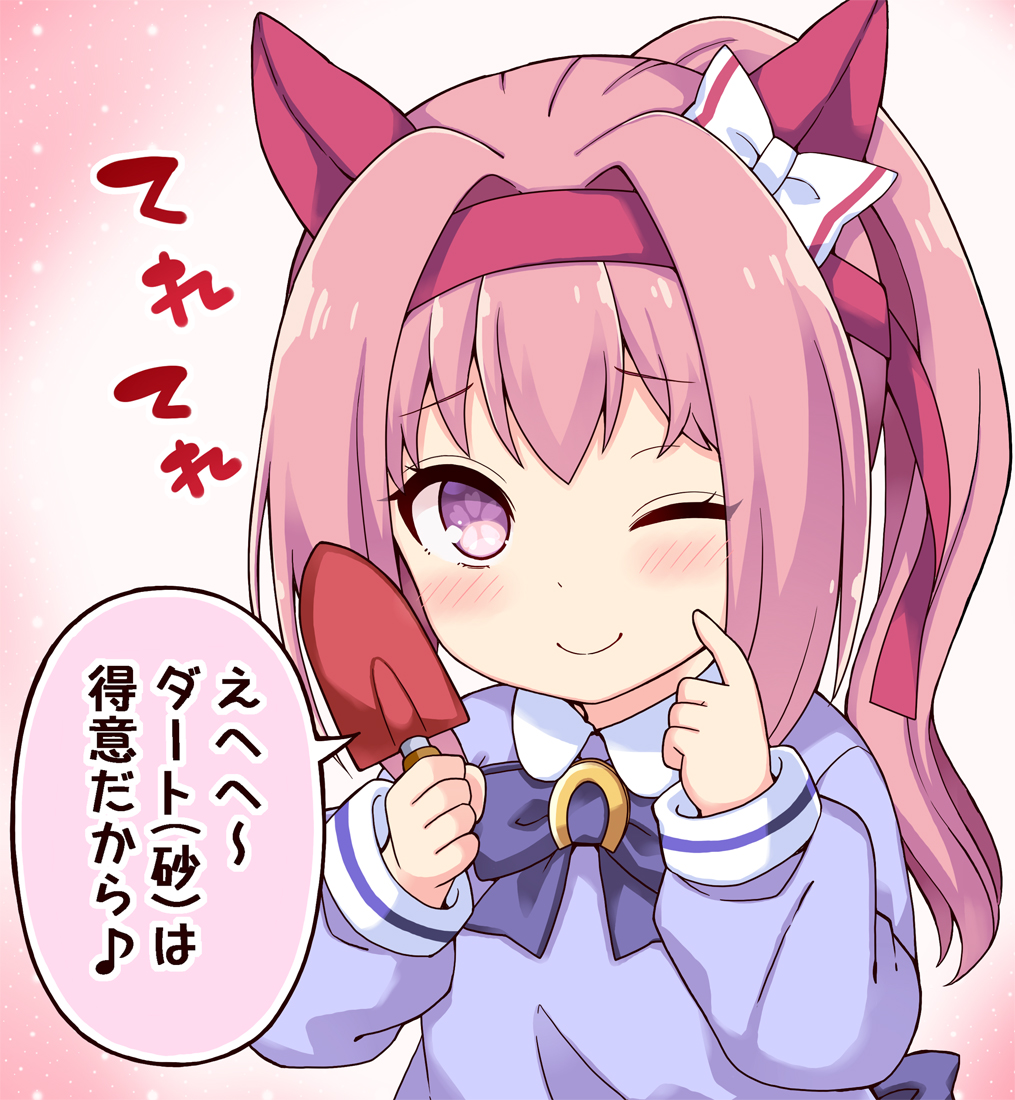 1girl ;) adapted_costume aged_down animal_ears blue_bow blue_shirt blush bow closed_mouth collared_shirt ear_bow flower-shaped_pupils hairband haru_urara_(umamusume) holding holding_trowel horse_ears kindergarten_uniform long_hair long_sleeves one_eye_closed pink_hair ponytail puffy_long_sleeves puffy_sleeves purple_eyes red_hairband rioshi shirt smile solo symbol-shaped_pupils translation_request trowel umamusume white_bow