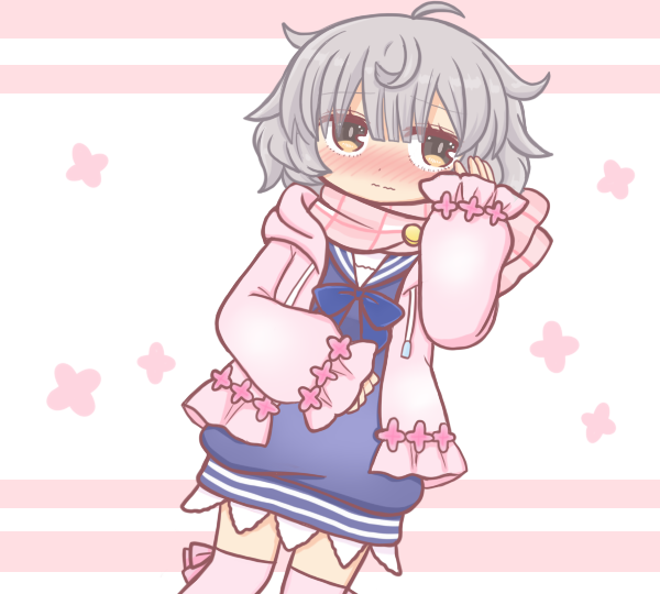 1girl ahoge blue_dress blue_ribbon blue_sailor_collar blunt_bangs blush bow_legwear clenched_hand cosplay cowboy_shot drawstring dress dutch_angle embarrassed flower_symbol flower_trim frilled_dress frills grey_hair hand_on_own_face hand_on_own_stomach hood hoodie long_sleeves looking_away magia_record:_mahou_shoujo_madoka_magica_gaiden mahou_shoujo_madoka_magica miwa_mitsune neck_ribbon open_clothes open_hoodie orange_eyes pink_background pink_hoodie pink_scarf pink_thighhighs plaid_clothes plaid_scarf reverse_(bluefencer) ribbon sailor_collar sailor_dress scarf short_dress short_hair simple_background solo split_mouth standing swept_bangs thighhighs wavy_mouth yakumo_mikage yakumo_mikage_(cosplay) yakumo_mikage_(winter_costume) zettai_ryouiki