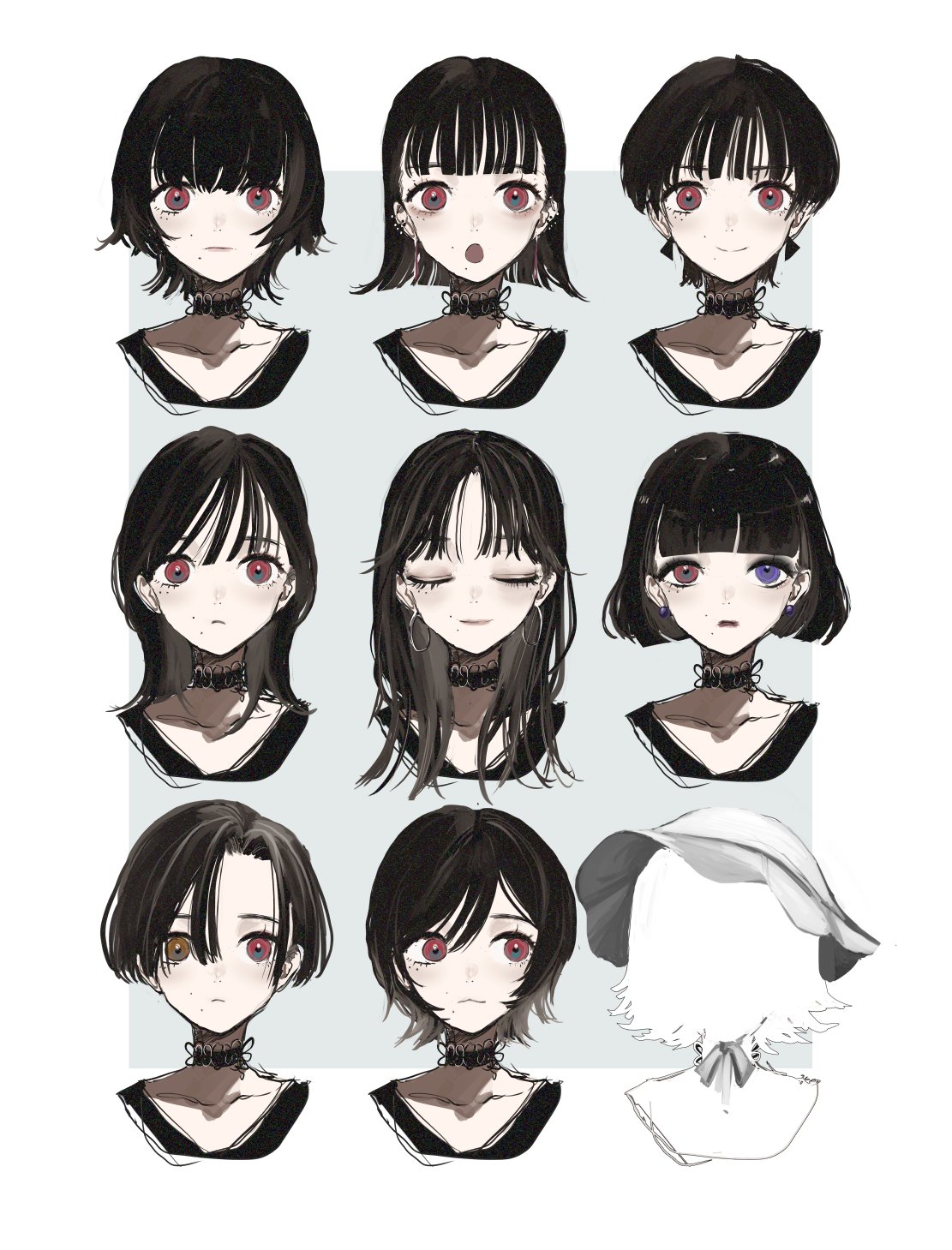 6+girls :o black_choker black_hair border brown_hair choker closed_mouth earrings heterochromia highres jewelry long_hair looking_at_viewer mole mole_under_eye mole_under_mouth multiple_girls narue open_mouth orange_eyes original purple_eyes red_eyes smile white_border wide-eyed