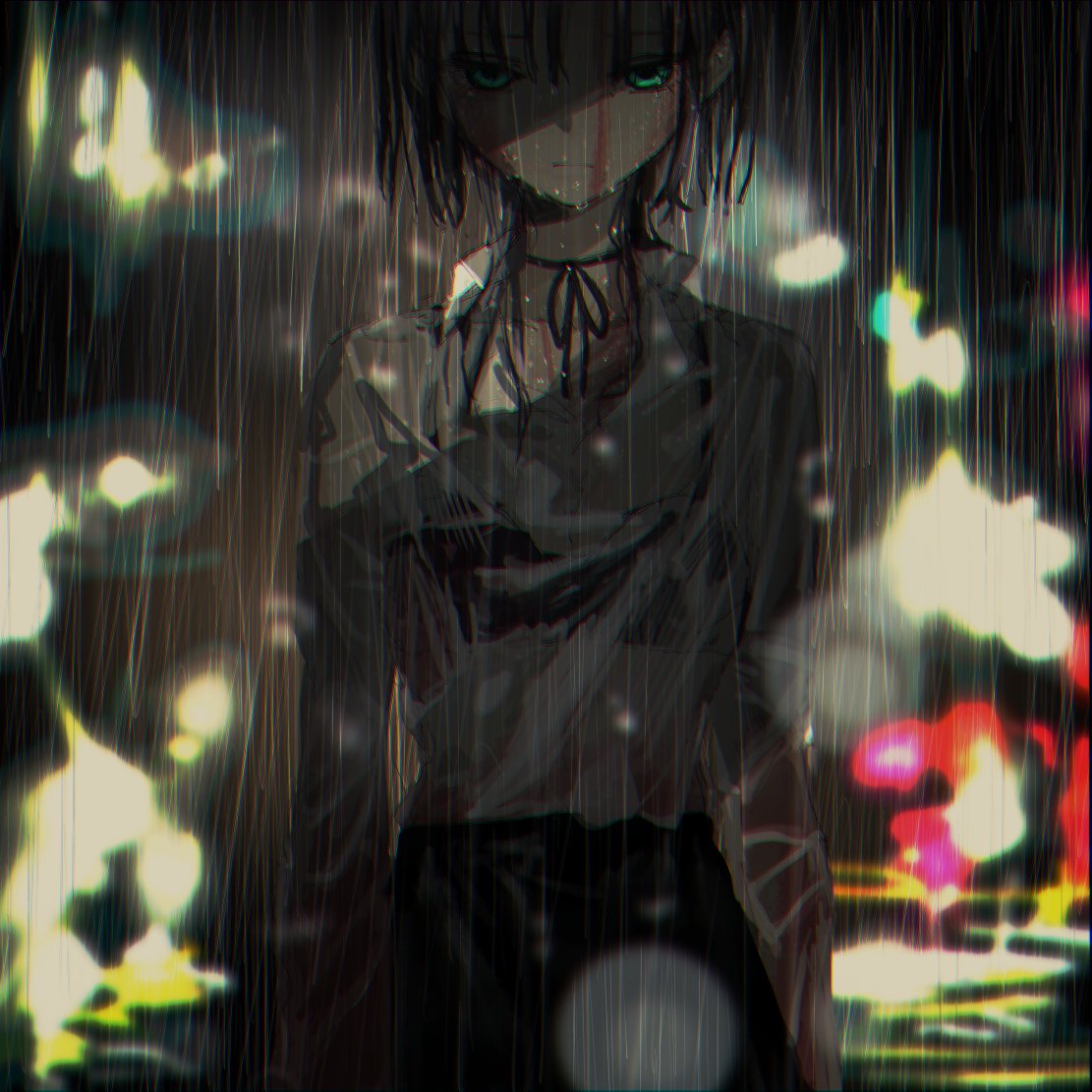 1girl black_bra blood blood_on_face blurry blurry_background bra bra_visible_through_clothes closed_mouth cowboy_shot depth_of_field green_eyes looking_at_viewer narue original rain shirt solo standing underwear wet wet_clothes wet_shirt white_shirt