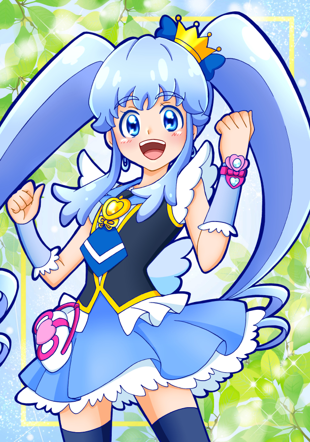 black_thighhighs blue_background blue_eyes blue_hair blue_skirt brooch cowboy_shot crown cure_princess earrings gold_crown hair_between_eyes happinesscharge_precure! heart heart_brooch jewelry looking_at_viewer magical_girl mini_crown open_mouth plant precure shihou_rebu shirayuki_hime short_sleeves skirt smile thighhighs twintails vest watch wing_brooch wing_earrings wrist_cuffs wristwatch