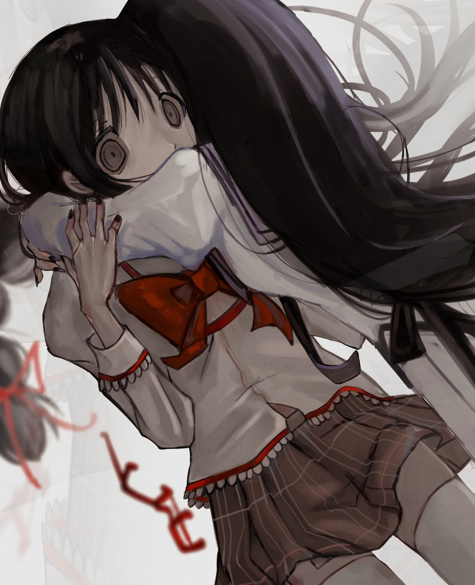 2girls akemi_homura black_hair black_nails bow bowtie braid brown_eyes brown_skirt commentary english_commentary glasses hair_ribbon highres hug long_hair mahou_shoujo_madoka_magica mahou_shoujo_madoka_magica_(anime) multiple_girls nail_polish plaid_clothes plaid_skirt pleated_skirt r_(reijibnuy2) red-framed_eyewear red_bow red_bowtie red_ribbon ribbon skirt thighhighs twin_braids unworn_eyewear white_legwear