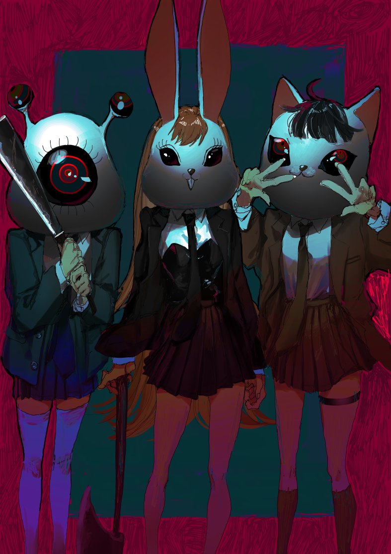 axe black_hair black_jacket black_necktie black_skirt black_vest blue_jacket blue_skirt brown_hair brown_jacket brown_legwear brown_necktie brown_skirt cat_mask contrapposto double_w facing_viewer hands_up holding holding_axe holding_weapon jacket long_hair machete mask miniskirt narue necktie open_clothes open_jacket original pleated_skirt rabbit_mask shirt skirt socks thigh_strap thighhighs two-handed vest w weapon white_legwear white_shirt zettai_ryouiki