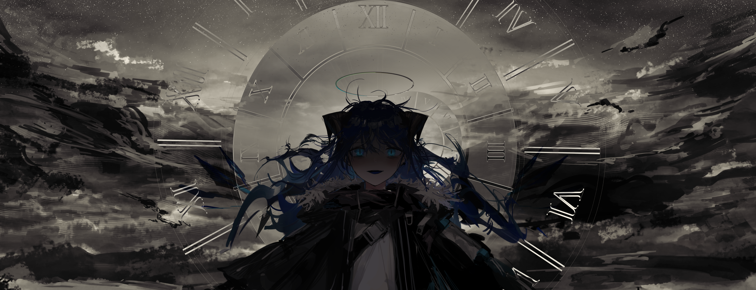 1girl :d arknights bad_id bad_pixiv_id black_jacket blue_eyes blue_hair chest_belt cloud crazy_eyes crazy_smile dark_cloud female_focus grey_sky halo highres horns jacket looking_at_viewer mostima_(arknights) narue open_mouth roman_numeral shaded_face shirt sky slit_pupils smile solo star_(sky) starry_sky white_shirt