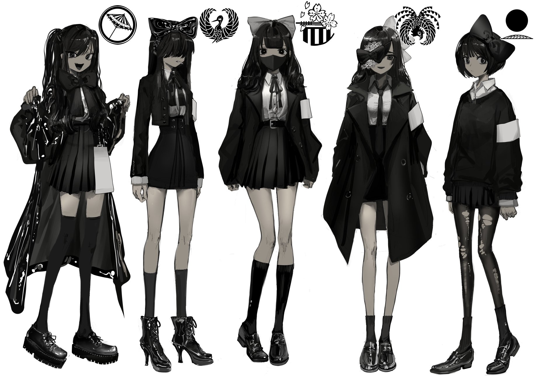 5girls :d ankle_boots armband black_coat black_necktie black_sweater boots bow closed_mouth coat greyscale hair_bow hair_over_eyes high-waist_skirt high_heel_boots high_heels highres loafers long_hair long_sleeves looking_at_viewer mask miniskirt monochrome mouth_hold mouth_mask multiple_girls narue neck_ribbon necktie open_mouth original pantyhose pleated_skirt ribbon shirt shoes simple_background skirt smile socks socks_over_pantyhose standing sweater thighhighs torn_clothes torn_legwear twintails white_background white_necktie white_shirt zettai_ryouiki