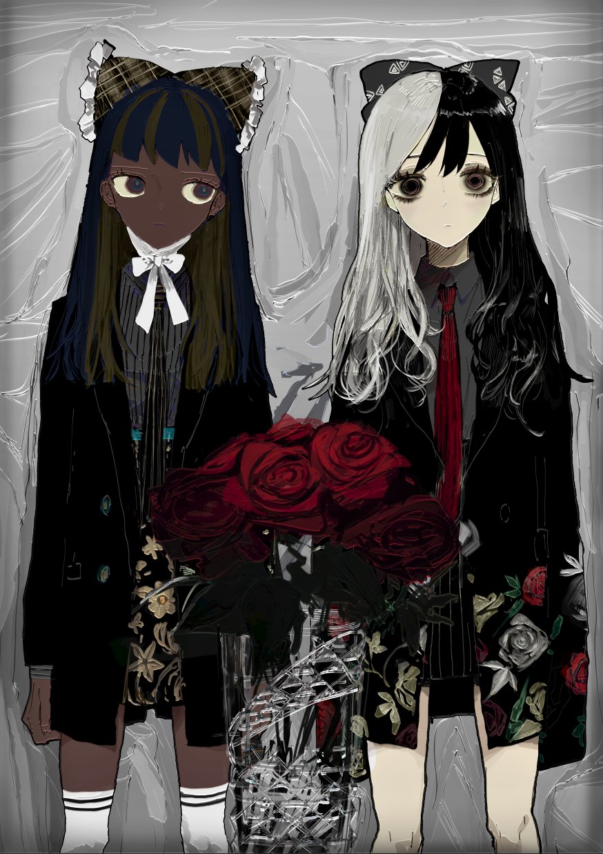 black_hair black_jacket blonde_hair blue_hair bouquet bow brown_eyes closed_mouth collared_shirt dark-skinned_female dark_skin flower grey_shirt hair_bow highres jacket looking_at_viewer multicolored_hair narue neck_ribbon necktie red_flower red_necktie red_rose ribbon rose shirt striped_clothes striped_shirt thighhighs two-tone_hair white_hair white_legwear white_ribbon wing_collar yellow_eyes