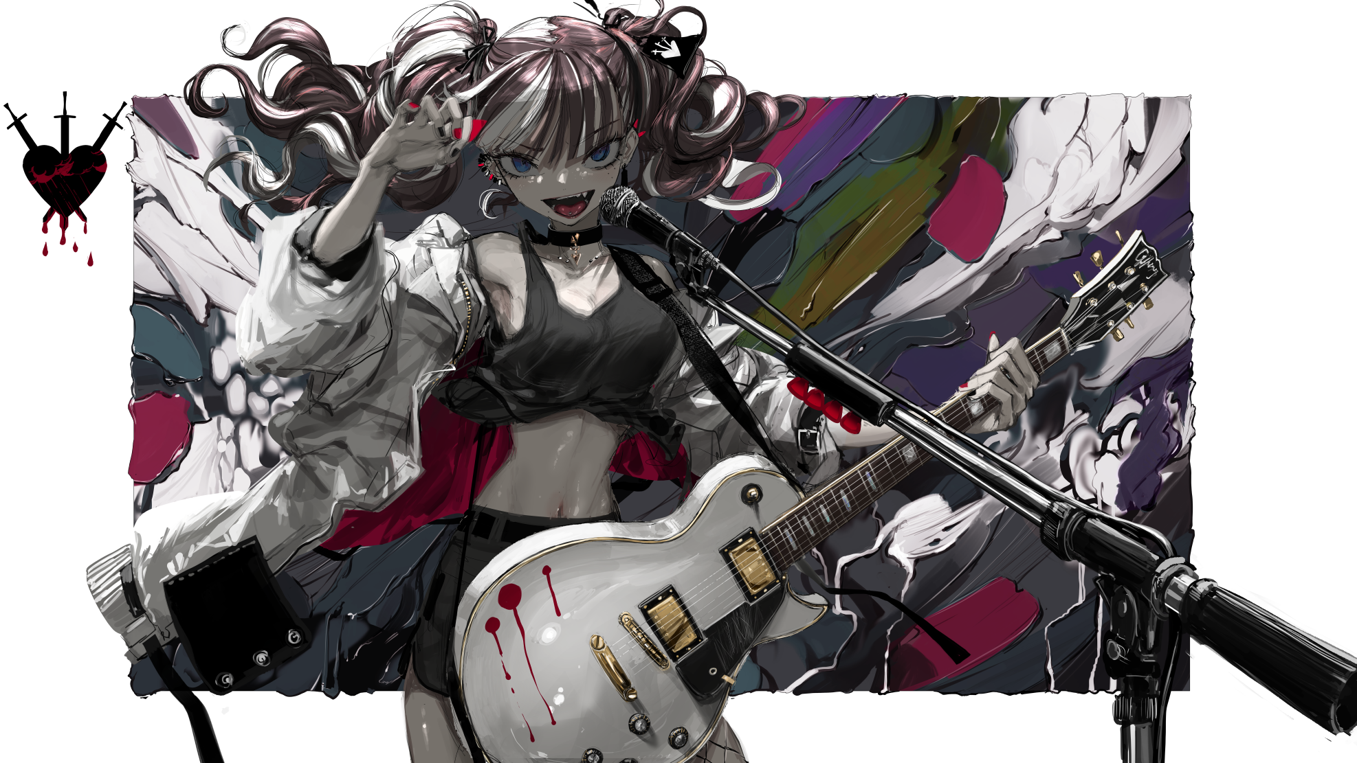 1girl :d black_choker black_shirt blue_eyes breasts choker contrapposto ear_piercing earrings electric_guitar fang fishnet_legwear fishnets floating_hair gibson_les_paul guitar highres holding holding_instrument holding_plectrum instrument jacket jewelry looking_at_viewer medium_breasts microphone microphone_stand midriff miniskirt multicolored_background multicolored_hair narue navel open_clothes open_jacket open_mouth original piercing plectrum shirt skirt smile solo streaked_hair tank_top twintails white_jacket