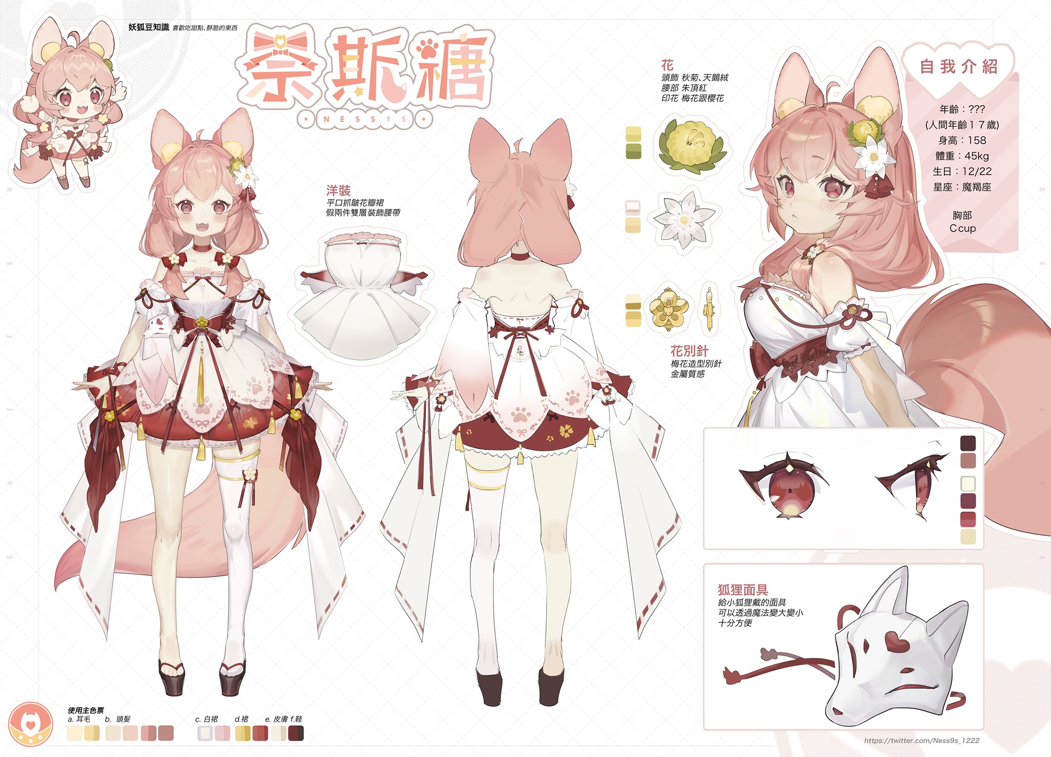 ahoge akucat_project animal_ear_fluff animal_ears bow breasts character_name character_profile reference_sheet chinese_text choker clog_sandals collarbone detached_sleeves dot_nose dress hair_flower flower_ornament fox_ears fox_mask frilled_dress frilled_skirt frills highres jamama japanese_clothes long_hair mask medium_breasts miko ness9s_(vtuber) paw_print pink_hair red_choker red_eyes red_skirt short_eyebrows sidelocks single_thighhigh skirt tagme tassel thighhighs twitter_username virtual_youtuber white_dress
