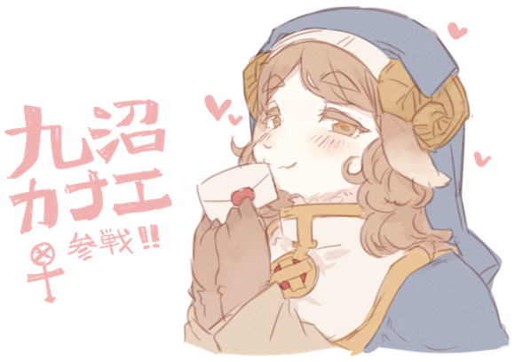 1girl 7010 animal_ears blush brown_eyes close-up closed_mouth commentary_request envelope furry heart holding holding_envelope horns light_brown_hair long_sleeves looking_at_viewer looking_to_the_side original simple_background tareme thick_eyebrows translation_request white_background