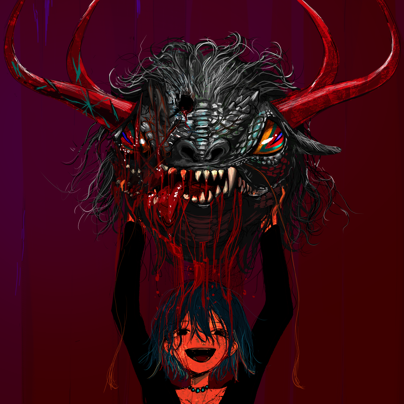 1girl :d antlers black_eyes blood blood_on_face blue_hair bob_cut hands_up highres horns jewelry looking_at_viewer monster multicolored_hair narue necklace open_mouth original red_background severed_head short_hair smile solo streaked_hair