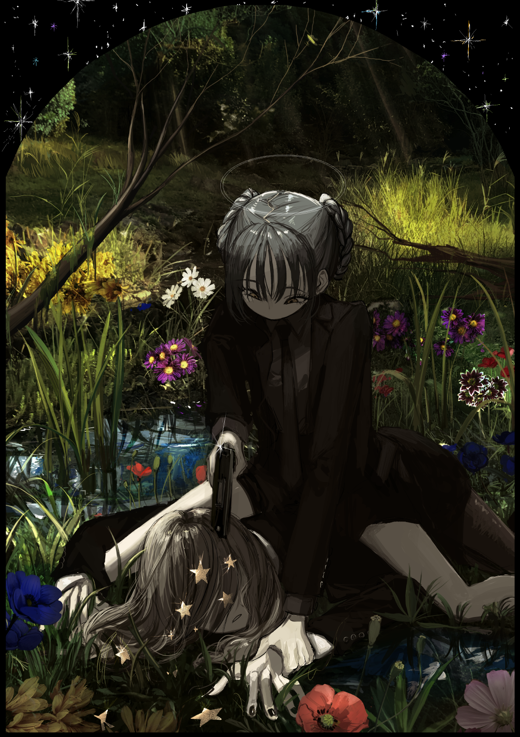 2girls black_border black_jacket black_nails black_necktie border braid braided_bun brown_eyes colored_skin double_bun fingernails flower grass grey_hair gun_to_head hair_bun halo highres holding_another's_wrist jacket long_sleeves multiple_girls nail_polish narue necktie original outdoors parted_lips straddling white_skin