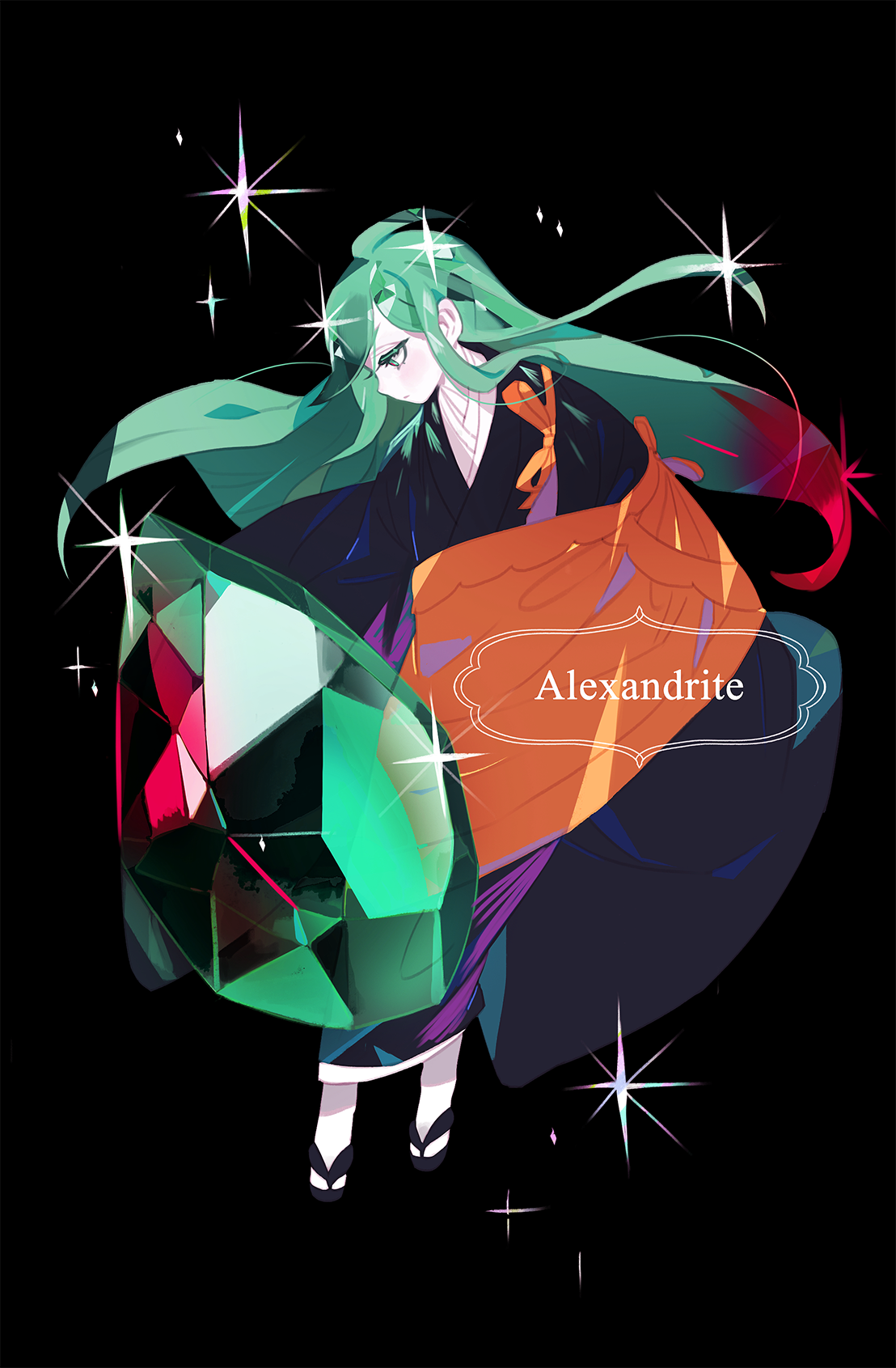 1other alexandrite_(houseki_no_kuni) androgynous black_background black_kimono character_name colored_eyelashes cosplay eyelashes floating_hair full_body gem green_gem green_hair gwayo highres houseki_no_kuni japanese_clothes kesa kimono kongou_sensei kongou_sensei_(cosplay) long_hair long_sleeves looking_away looking_down name_connection object_namesake profile red_gem red_hair sandals simple_background sleeves_past_fingers sleeves_past_wrists solo sparkle tabi very_long_hair white_legwear wide_sleeves zouri