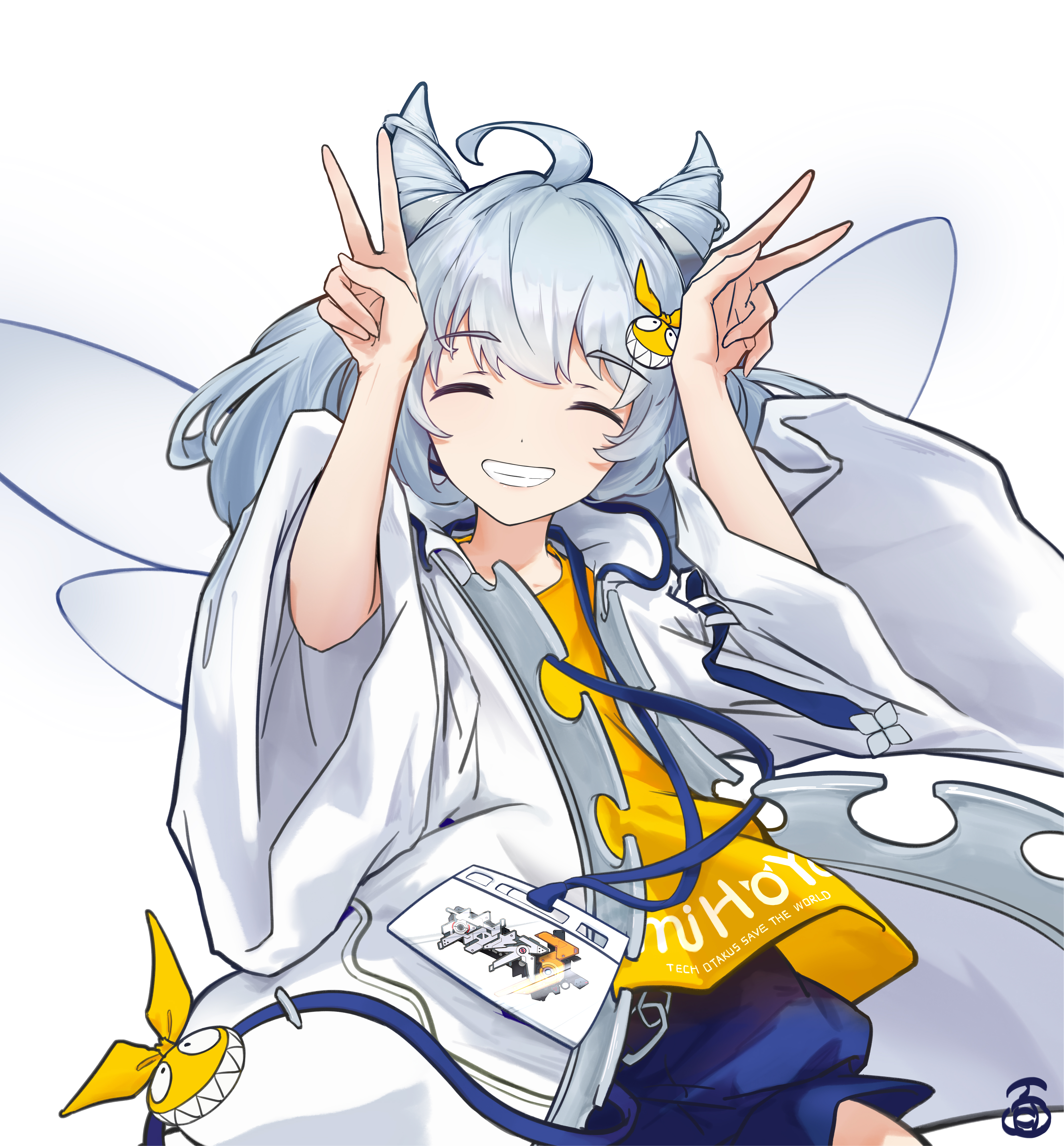 1girl :d absurdres ahoge blue_shorts closed_eyes coat cyslm double_v grin highres homu_(honkai_impact) honkai_(series) honkai_impact_3rd id_card lab_coat long_hair long_sleeves mihoyo miyouji open_mouth shirt shorts simple_background smile solo teeth v white_background white_coat white_hair yellow_shirt
