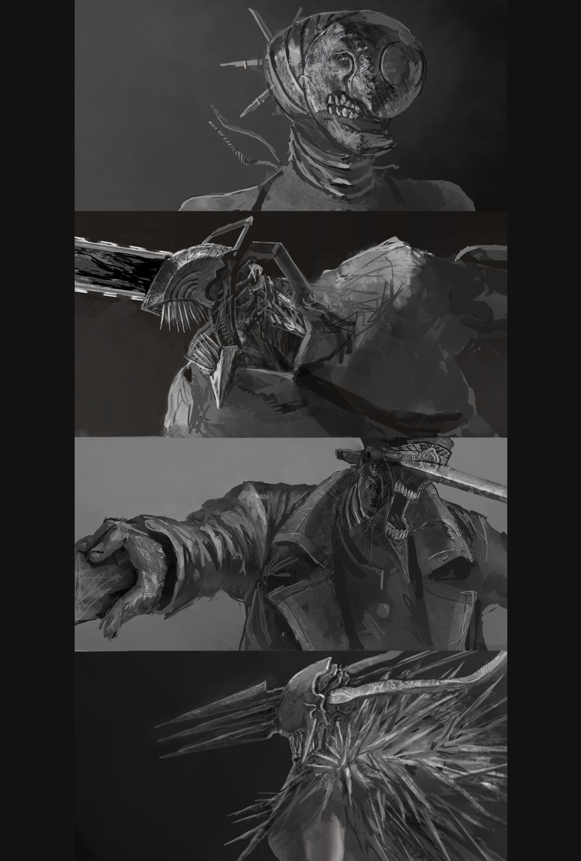 2boys 2girls absurdres arrow_(projectile) black_necktie bomb_devil_(chainsaw_man) chainsaw chainsaw_man coat collage collar collared_shirt crossbow_devil_(chainsaw_man) denji_(chainsaw_man) facing_away facing_to_the_side grey_background greyscale highres horns hybrid katana katana_man_(chainsaw_man) kishima_(ki123454321) long_horns long_sleeves monochrome multiple_boys multiple_girls necktie open_mouth pillarboxed quanxi_(chainsaw_man) reze_(chainsaw_man) sharp_teeth shirt simple_background spikes sword teeth trench_coat weapon white_shirt