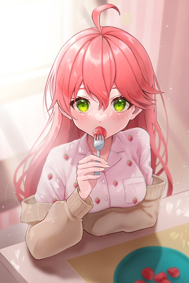 1girl ahoge arm_on_table blush breasts cardigan commentary eating food fork fruit green_eyes hair_between_eyes highres holding holding_fork hololive jacket jacket_partially_removed long_hair looking_at_viewer medium_breasts pink_hair plate sakura_miko shirt soda_dokka_ikou solo strawberry table upper_body virtual_youtuber
