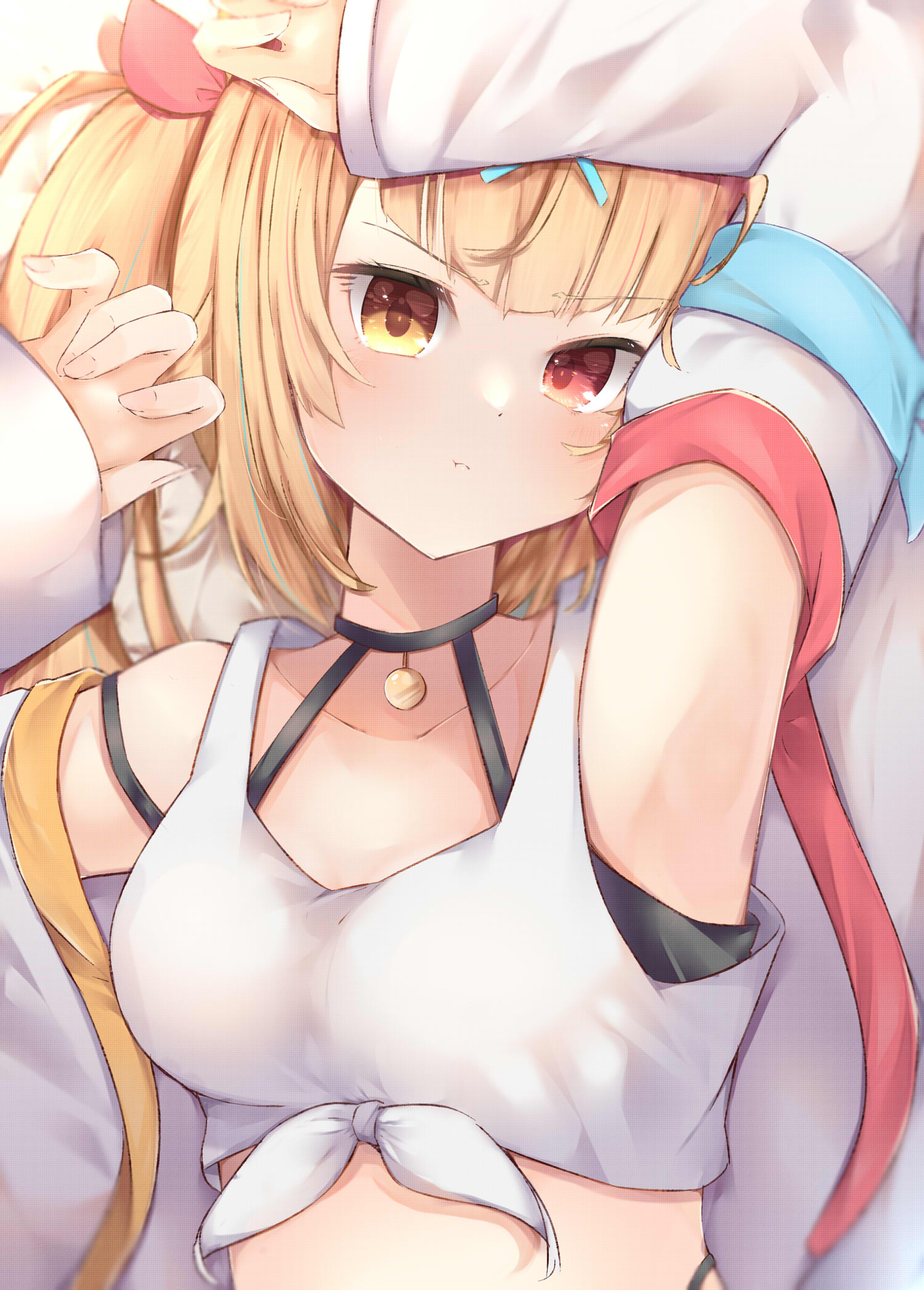 1girl :t arm_up armpits bare_shoulders blonde_hair choker crop_top detached_sleeves hair_ribbon heterochromia highres hoshikawa_sara hoshikawa_sara_(1st_costume) long_hair navel nijisanji pout red_eyes ribbon solo sorahachi_(sora823) tank_top two_side_up virtual_youtuber