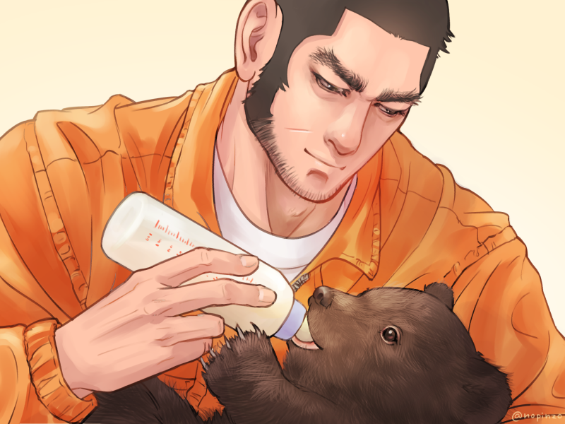 1boy animal artist_name bear beard black_hair bottle cub drinking facial_hair golden_kamuy holding holding_animal long_sideburns looking_at_animal male_focus milk_bottle nopinzo orange_shirt shirt short_hair sideburns simple_background solo tanigaki_genjirou thick_eyebrows upper_body