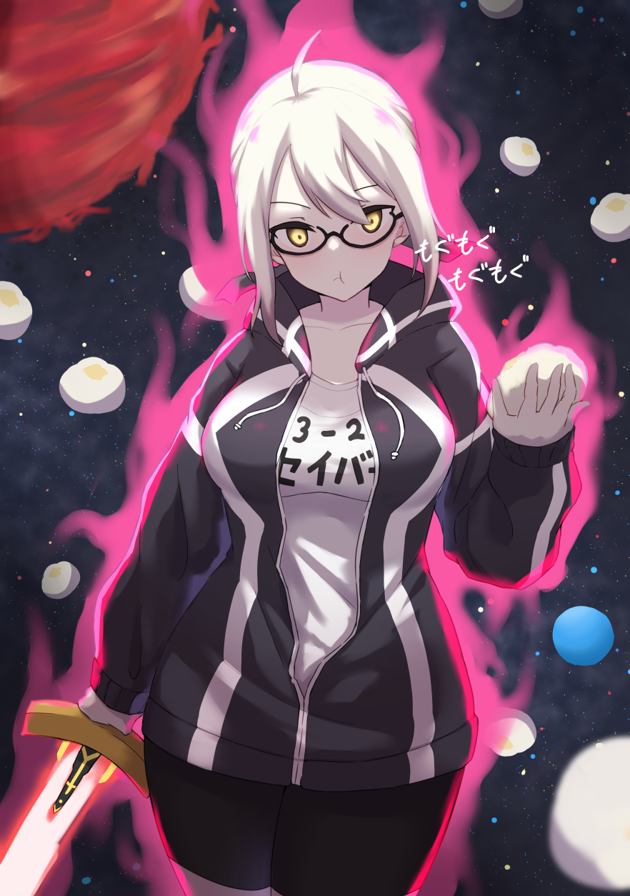 1girl ahoge artoria_pendragon_(fate) collarbone eating fate/grand_order fate_(series) food glasses glowing glowing_sword glowing_weapon highres holding holding_food holding_sword holding_weapon japanese_text lanthan mysterious_heroine_x_alter_(fate) name_tag partially_unzipped solo sword weapon yellow_eyes