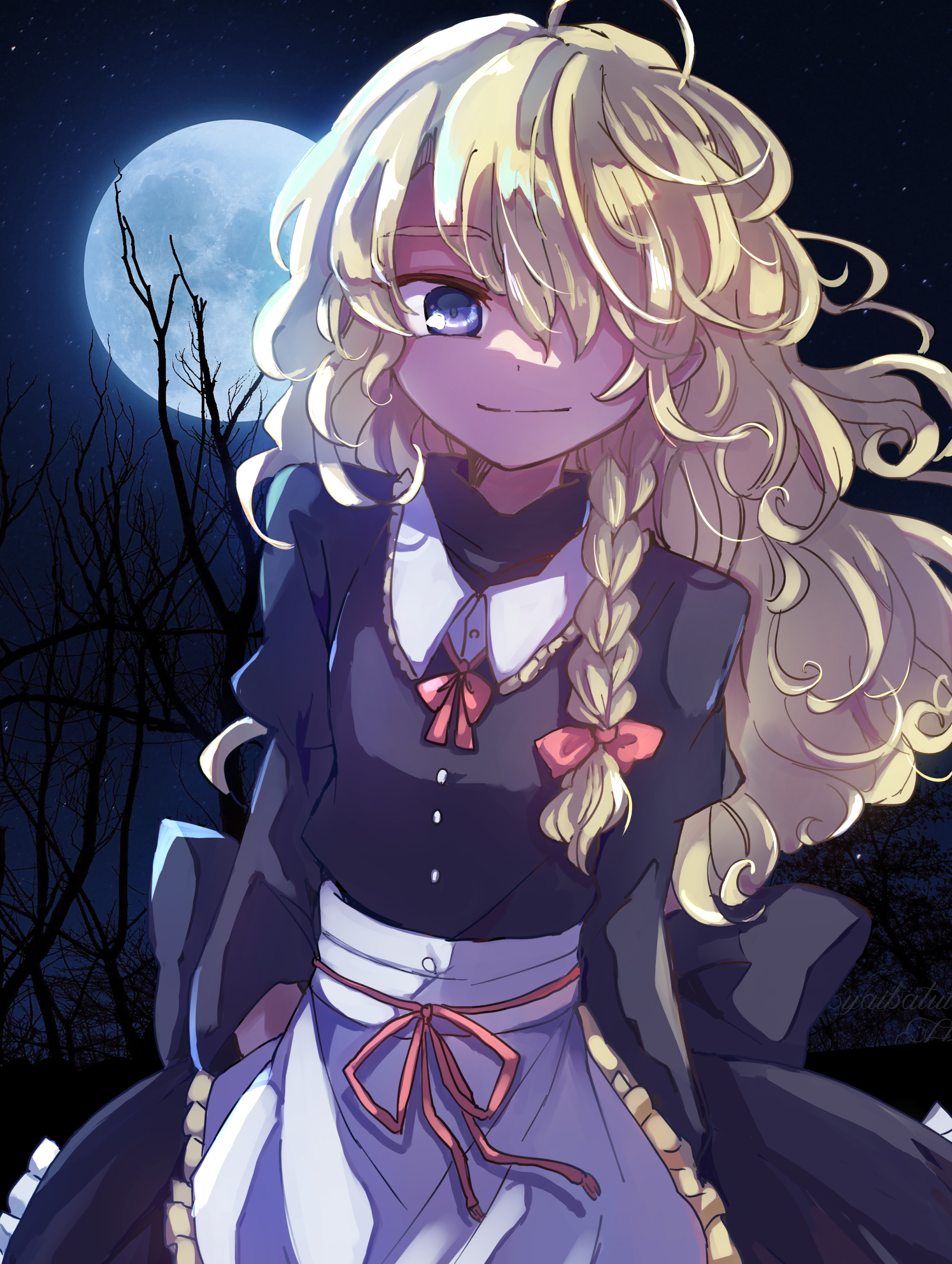 1girl absurdres ahoge alternate_eye_color apron artist_name back_bow black_bow black_dress black_sky blonde_hair blue_eyes blue_moon blue_sky bow bowtie braid branch buttons closed_mouth collared_dress commentary_request dress frills full_moon gradient_sky grey_apron hair_between_eyes hair_bow highres juliet_sleeves kirisame_marisa long_hair long_sleeves looking_at_viewer moon moonlight night missing_headwear puffy_sleeves red_bow red_bowtie single_braid sky smile solo standing star_(sky) starry_sky tigern touhou tree wavy_hair