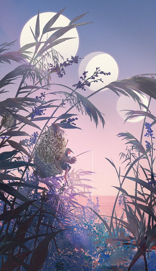 1other androgynous bird_tail crescent_moon feathered_wings fishing fishing_line fishing_rod full_moon gradient_sky grey_hair holding holding_fishing_rod hood hood_up horizon long_hair moon moon_phases nature nest original outdoors plant profile shorts sitting sky tail twilight water winged_arms wings wuya_(zhalv)