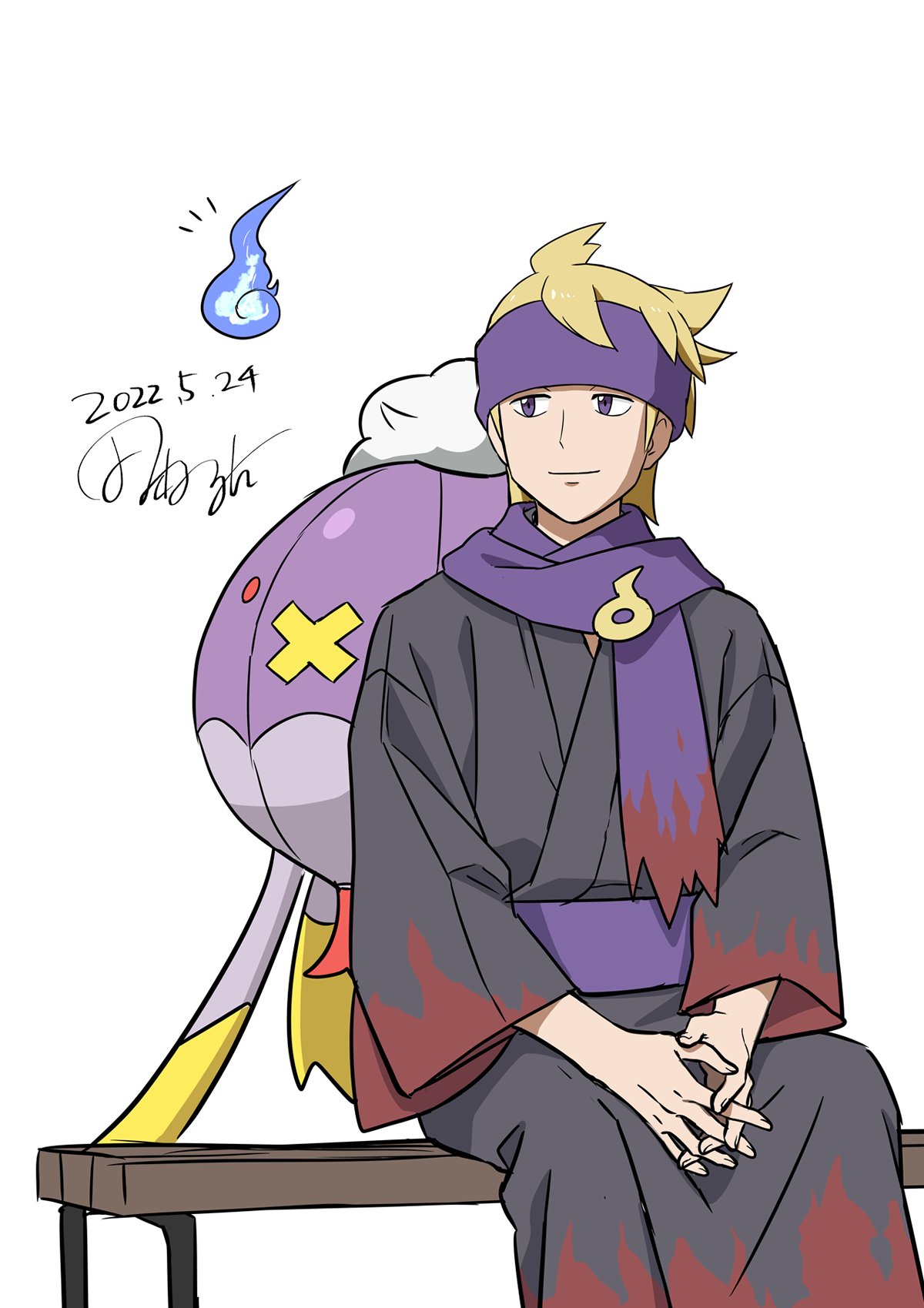 1boy alternate_costume bench blonde_hair closed_mouth commentary_request dated drifblim gen_4_pokemon grey_kimono headband highres interlocked_fingers japanese_clothes kimono looking_to_the_side male_focus morty_(pokemon) nintendo own_hands_together pokemon pokemon_(creature) pokemon_heartgold_and_soulsilver purple_eyes purple_headband purple_sash purple_scarf sash scarf short_hair signature sitting smile tamura_(kouititamura) white_background