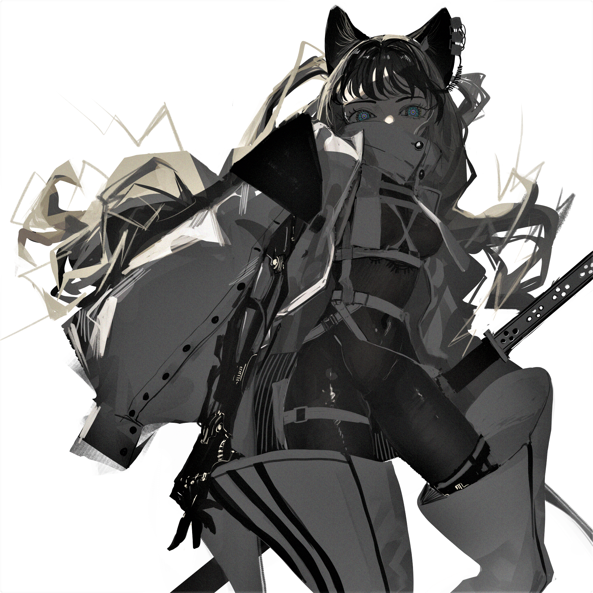 1girl animal_ears black_gloves black_hair blue_eyes bodysuit breasts cat_ears coat coat_on_shoulders covered_navel gloves grey_bodysuit highres katana looking_at_viewer medium_breasts narue original simple_background solo standing sword thighhighs weapon white_background white_coat white_thighhighs