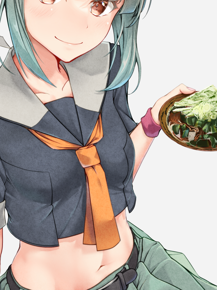 1girl belt belt_buckle black_belt black_shirt blush brown_eyes buckle closed_mouth crop_top green_hair green_skirt grey_background holding kantai_collection nagisa_nagi navel pleated_skirt shirt short_hair short_sleeves simple_background skirt smile solo yuubari_(kancolle) yuubari_kai_ni_(kancolle)