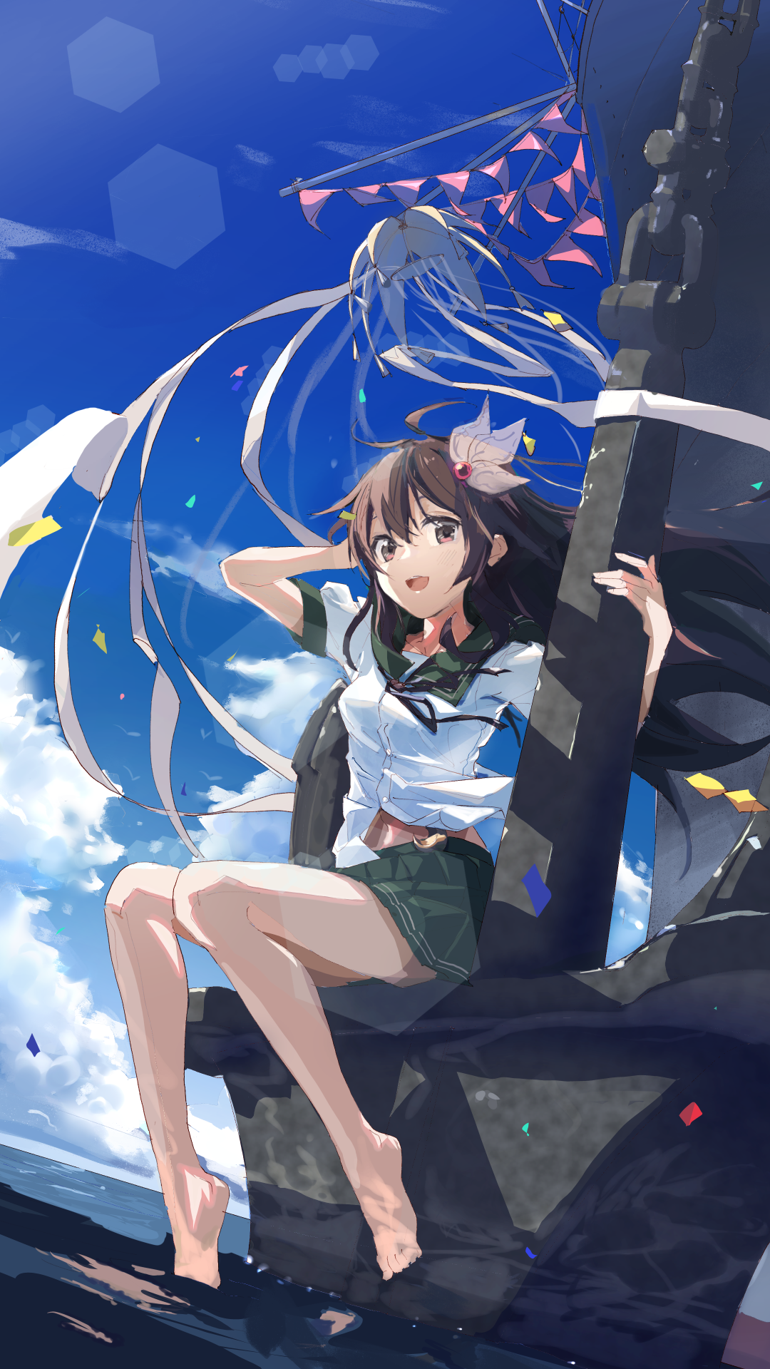 1girl blue_sky breasts brown_eyes brown_hair chamu_(chammkue) day green_skirt hair_ornament highres kantai_collection kisaragi_(kancolle) long_hair miniskirt outdoors pleated_skirt school_uniform serafuku shirt short_sleeves sitting skirt sky small_breasts soaking_feet solo white_shirt