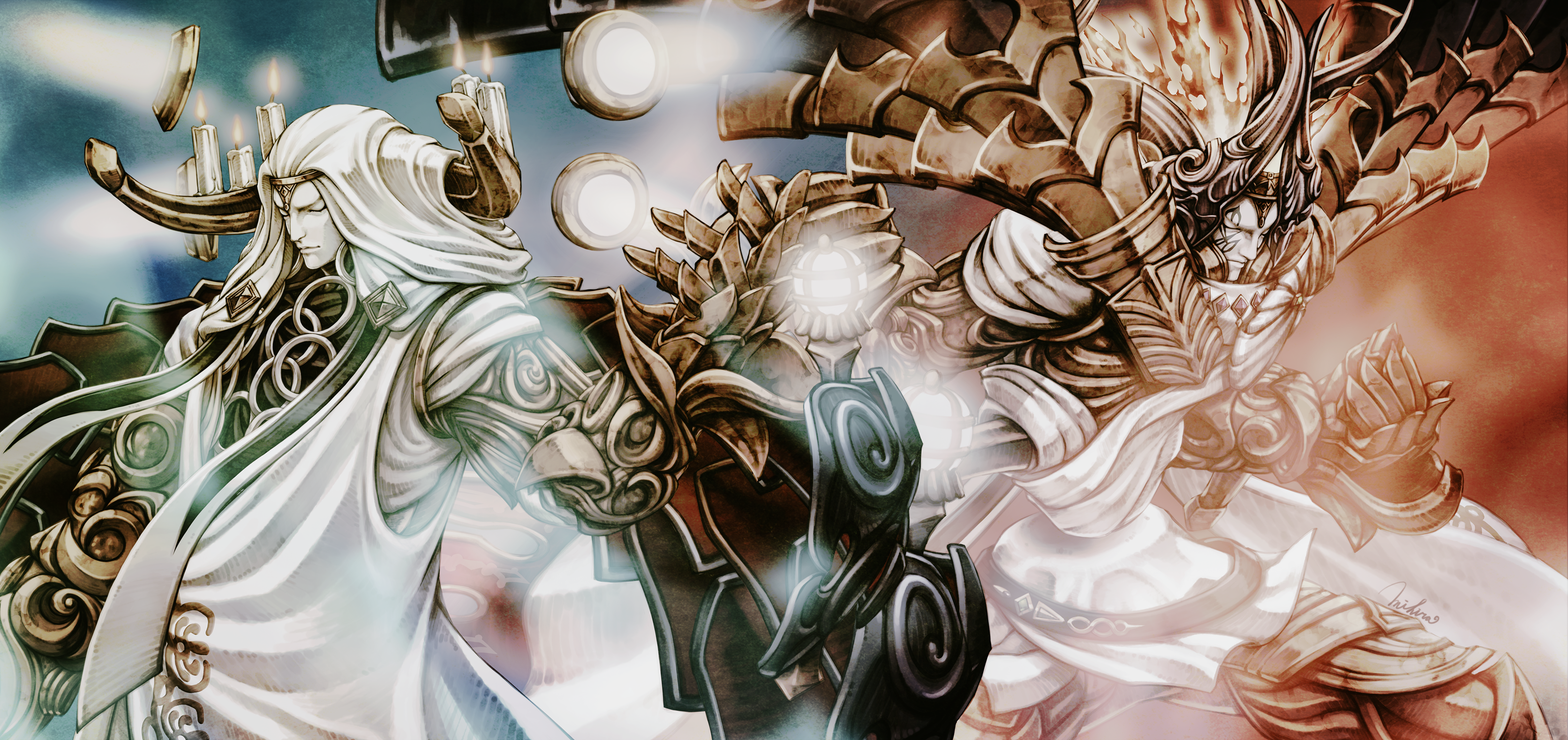 2boys absurdres armor candle cloak closed_mouth colored_skin dual_persona closed_eyes facial_tattoo final_fantasy final_fantasy_xiv gauntlets highres male_focus mihira_(tainosugatayaki) monster_boy multiple_boys nald'thal tattoo white_skin wings